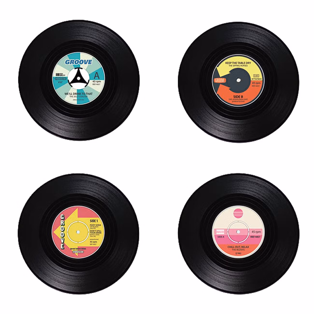 Skydda ditt bord från glasringar med stil med dessa retrosnygga drinkunderlägg designade som små vinylskivor. Passar alla tillfällen när det ska drickas runt bordet och är idealiska till 70- eller 80-talsfesten när du vill få dina gäster i den rätta stämningen.