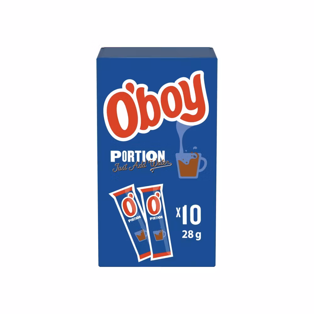 Portionsförpackad O'boy som blandas med vatten. Säljs i 10-pack där varje påse innehåller 28 gram chokladpulver.