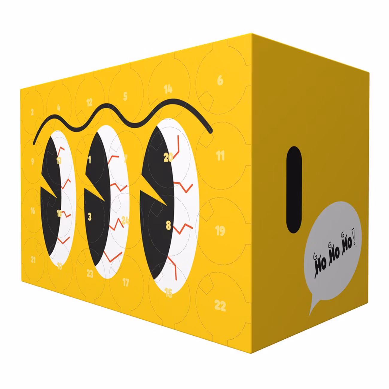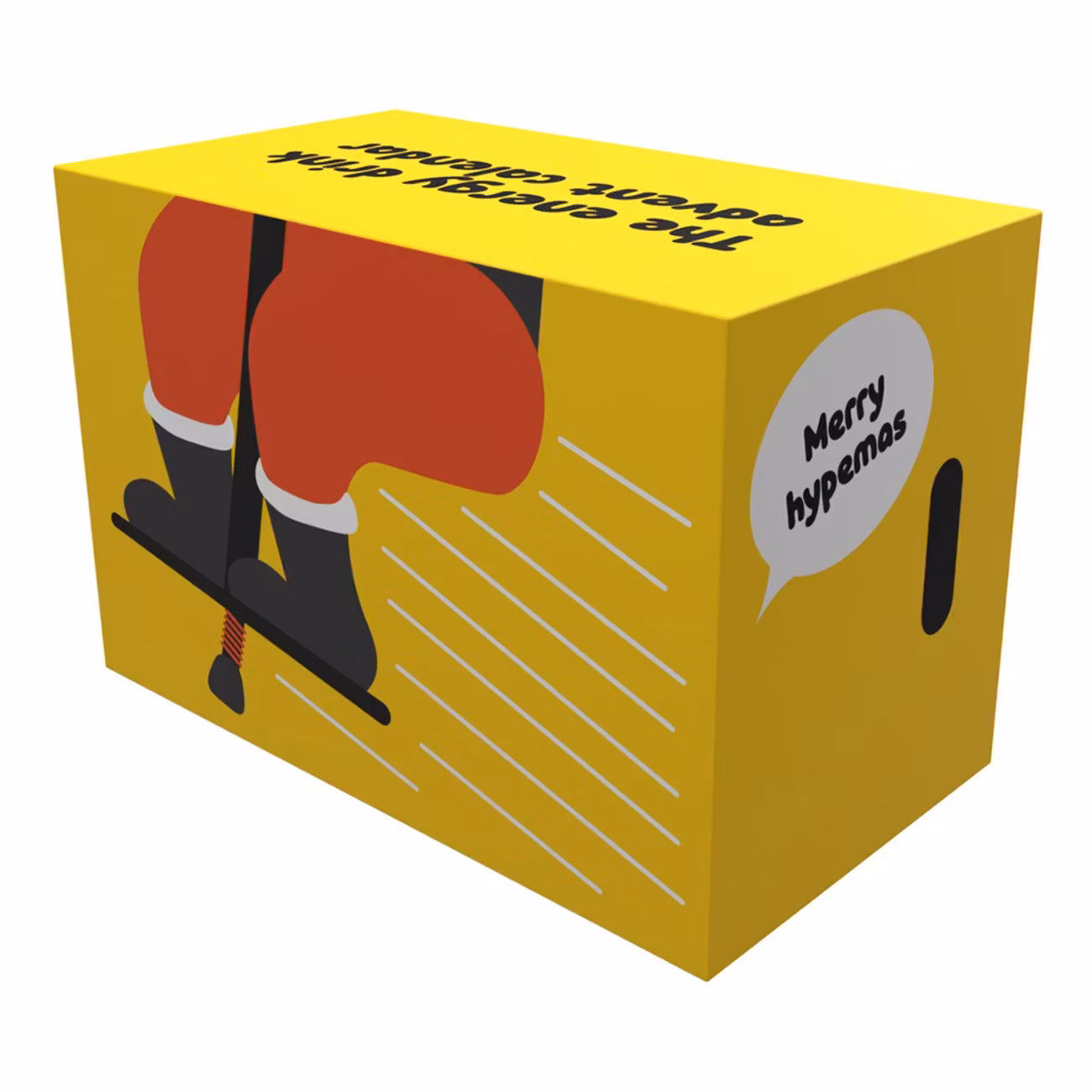 Julafton må vara en härlig dag, men resan dit är både besvärlig och krävande. Inte konstigt att folk är så trötta att dom somnar innan Kalle och hans vänner ens hunnit önska god jul när det äntligen blir den 24:e. Med den här energikalendern kan du överraska dig själv genom att gömma 24 burkar energidryck bakom luckorna, sen har du så du klarar dig hela jäktiga december! Merry Hypemass!
