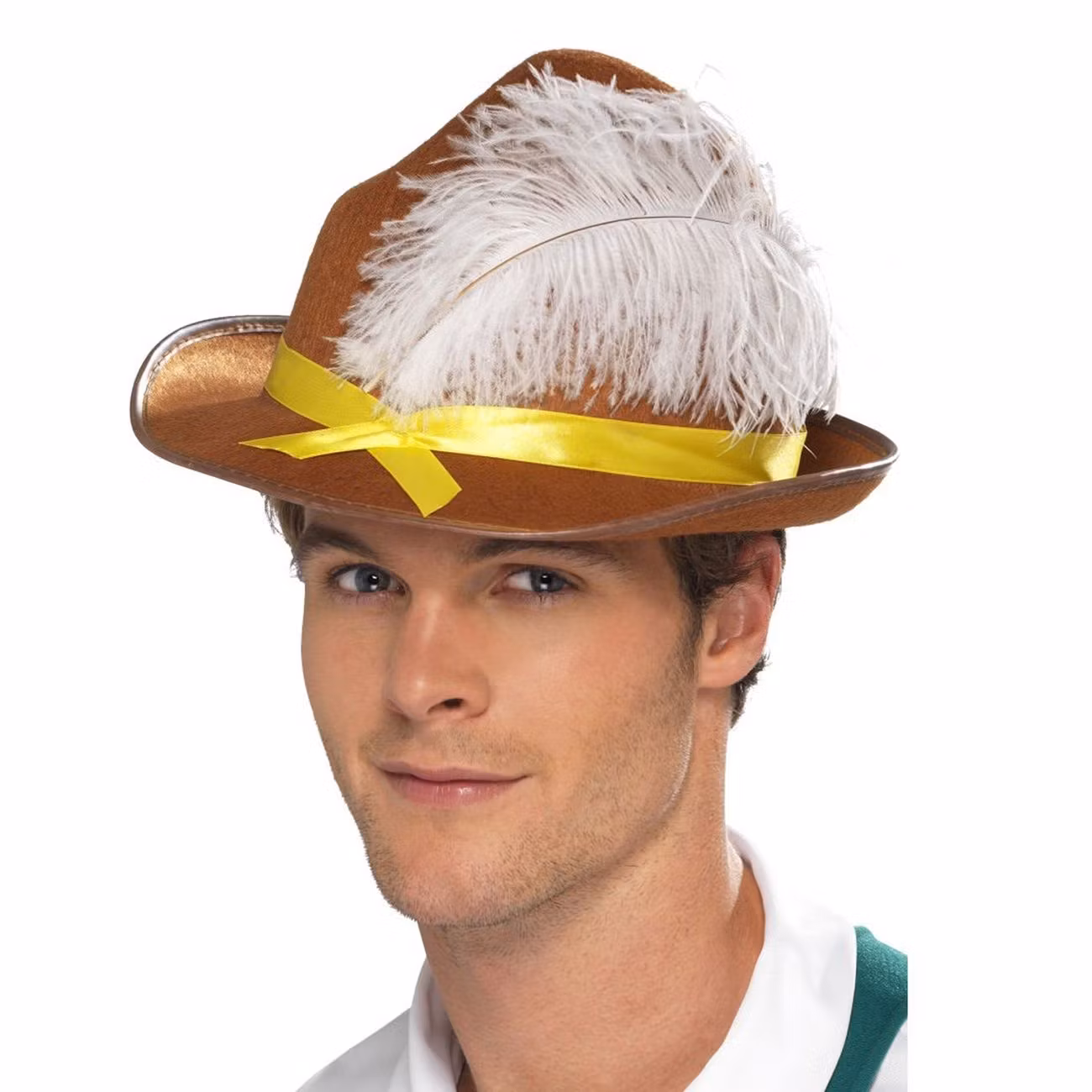 En stilig, brun hatt med gult band och vit fjäder som passar perfekt för alla Oktoberfest-firare. One size (vuxenstorlek).