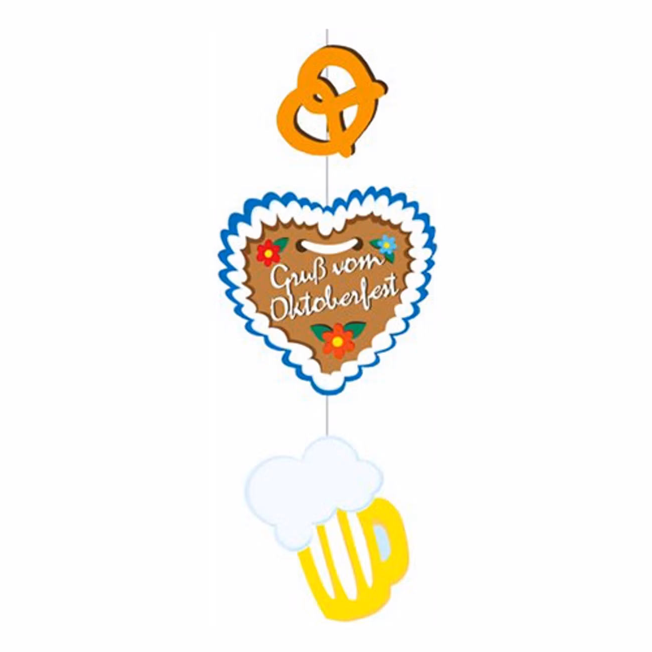 Gruß vom Oktoberfest Hängande Dekoration är en takdekoration med roliga pappmotiv föreställande en saltkringa, ett hjärta med texten "Gruß vom Oktoberfest" och ett ölglas längst ned. Snöre för enkel upphängning medföljer.