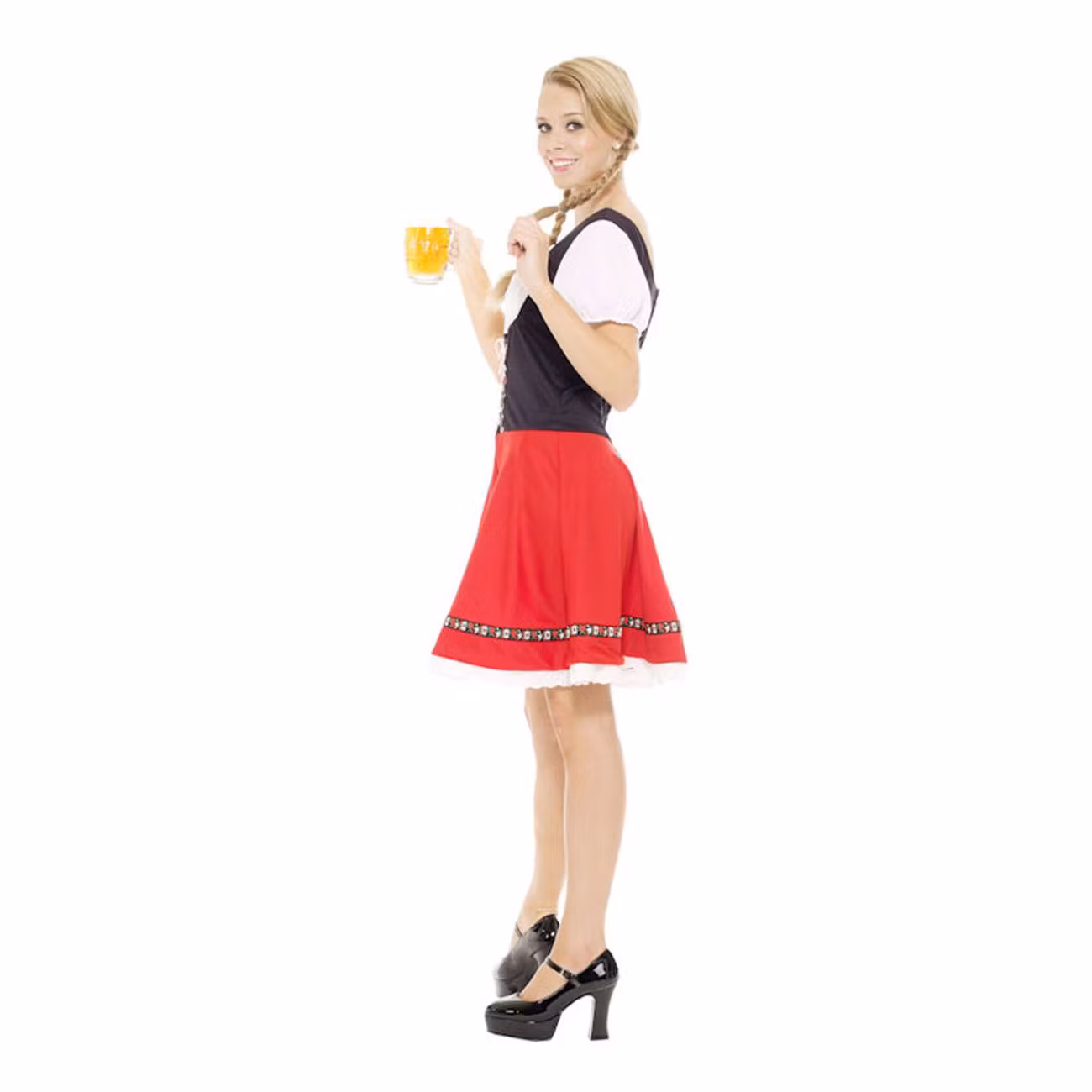 Heidi Maskeraddräkt inkluderar en vacker klänning med fastsatt röd kjol och mönstrade detaljer, en vit blus med resår och en svart väst med matchande mönster och vit byst samt vita axelmuddrar.