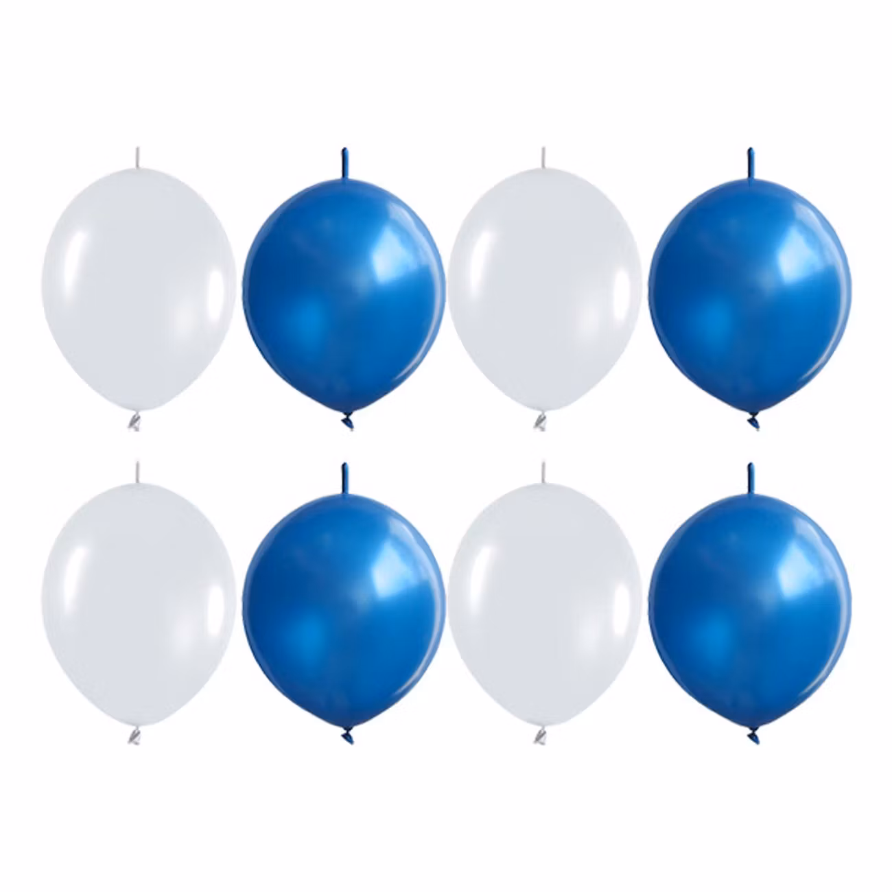 Kedjeballonger Oktoberfest är ett 8-pack kedjeballonger i färgerna blå och vit. Ballongerna knyts enkelt ihop med varandra till girlanger eller andra spännande formationer. Tillverkade av latex.