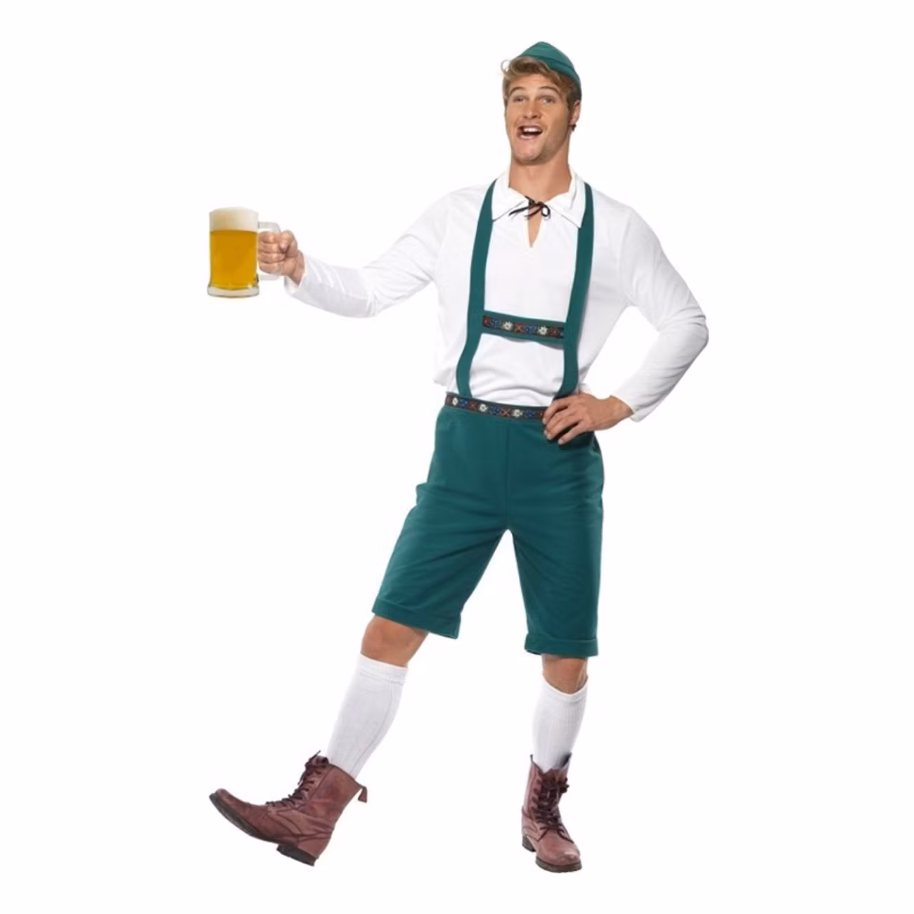 Oktoberfest Maskeraddräkt inkluderar en vit topp med långa ärmar och snörning runt halsen. Ingår gör även ett par matchande gröna lederhosen med hängslen samt en grön tyrolerhatt.