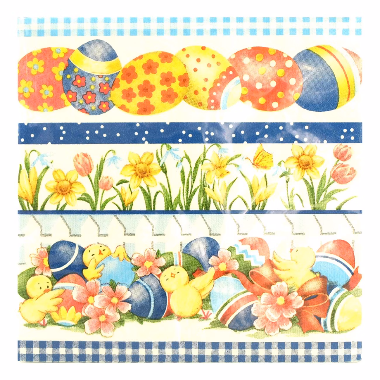Servetter Påsk Glada Kycklingar kommer med färgglatt och lekfullt motiv av målade påskägg, vackra blommor och söta glada kycklingar som leker bland påskägg. Servetterna är i tre lager och mäter utvikta 33 x 33 cm stora.