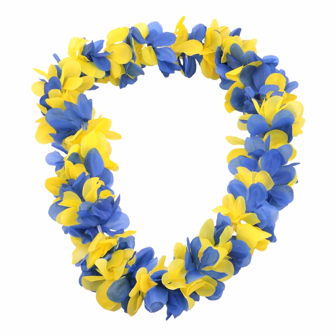 Blomsterhalsband Examen är en hawaiikrans med gula och blå tygblommor i polyester. Perfekt att hänga runt halsen på en nyutexaminerad ungdom som för sista gången säger "tack och hej" till skolbyggnaden.