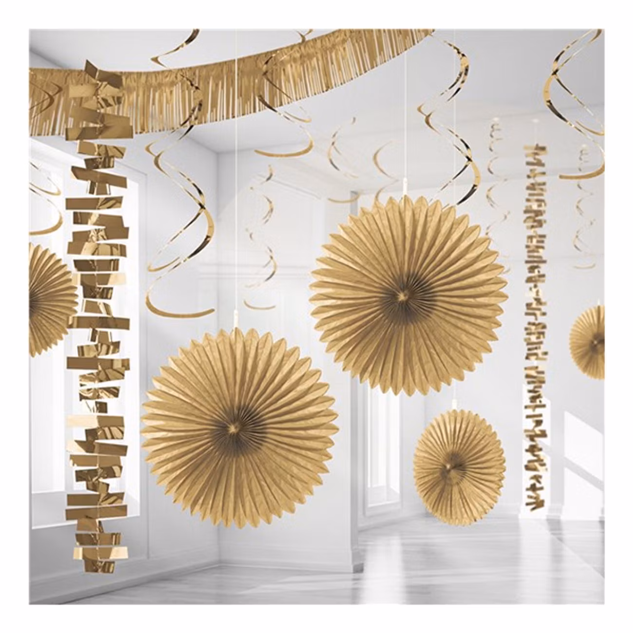 Dekorationskit Guld är en förpackning med guldfärgade kalasdekorationer. Förpackningen innehåller 3 pappersfjädrar som är 20 cm långa, 2 pappersfjädrar som är 40 cm långa, 10 swirls som är 55 cm stora, 1 hängande dekoration som är 2,7 m lång och 2 fransgirlanger som är 2 m långa.