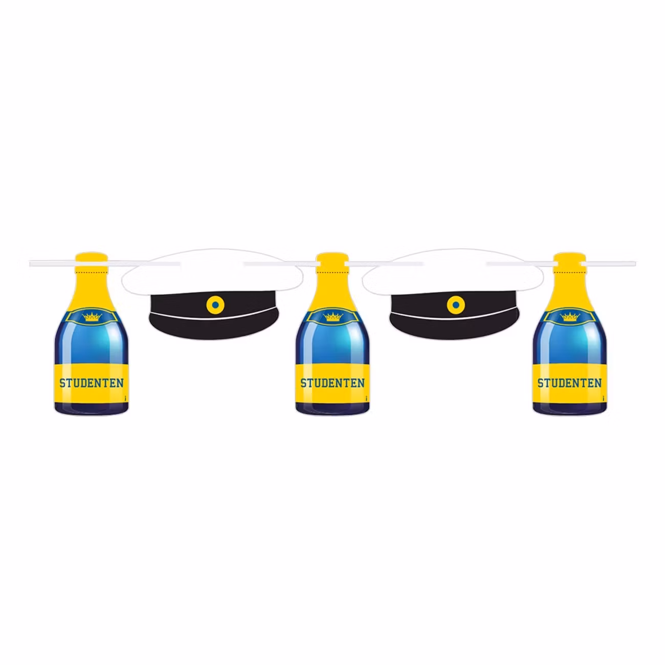 Girlang Studentmössa & Champagneflaska är en girland med champagneflaskor och studentmössor som motiv. Studentmössan är vit och svart, medan champagneflaskorna är gul och blå med texten: "studenten" mitt på flaskan. De passar strålande att hänga över matbordet eller dylikt!