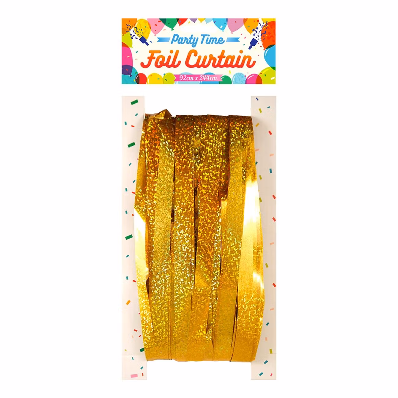 Glitterdraperi Holografisk Guld är ett draperi med flera remsor i guldfärgad folie som smidigt och enkelt fästs i en dörröppning med till exempel lite tejp.
