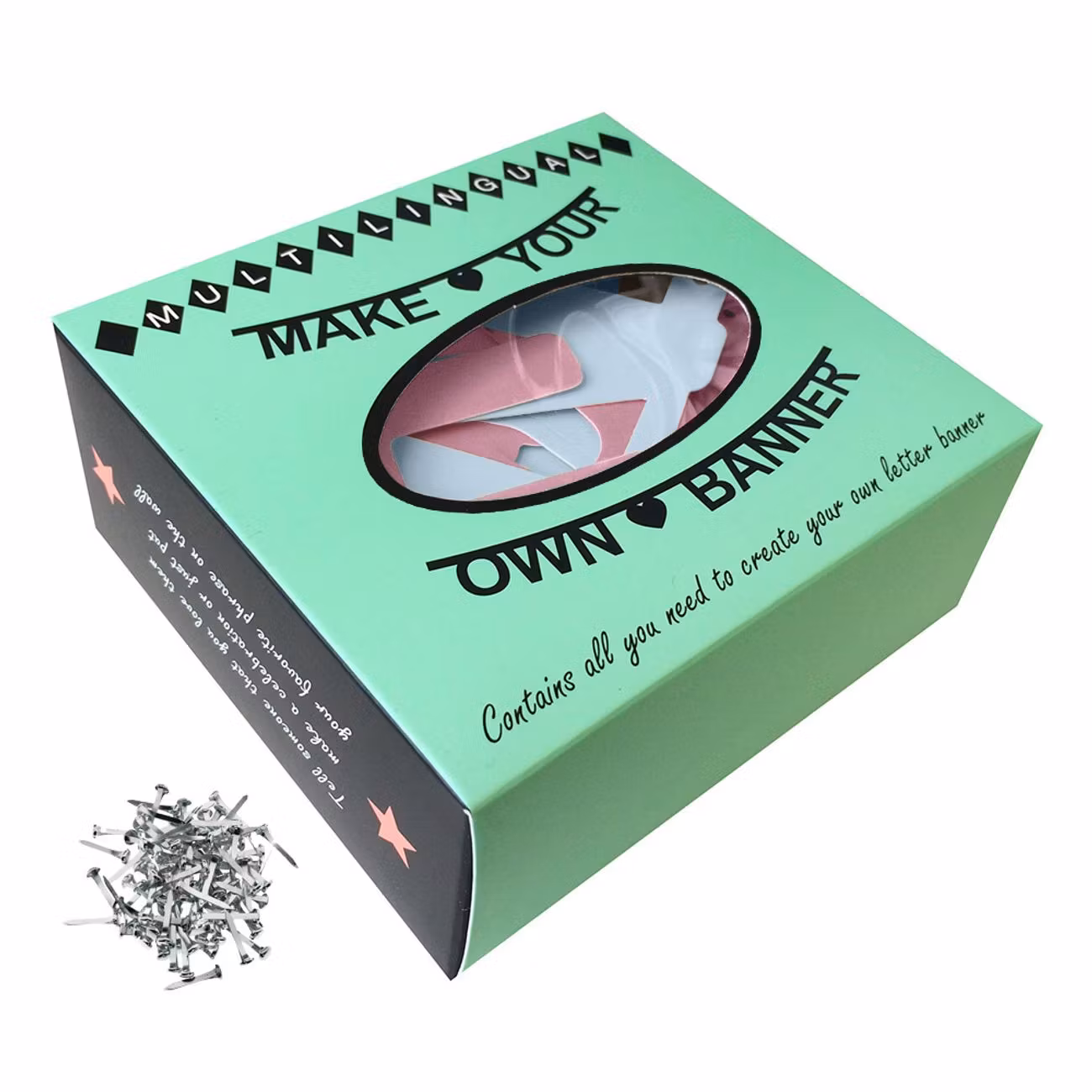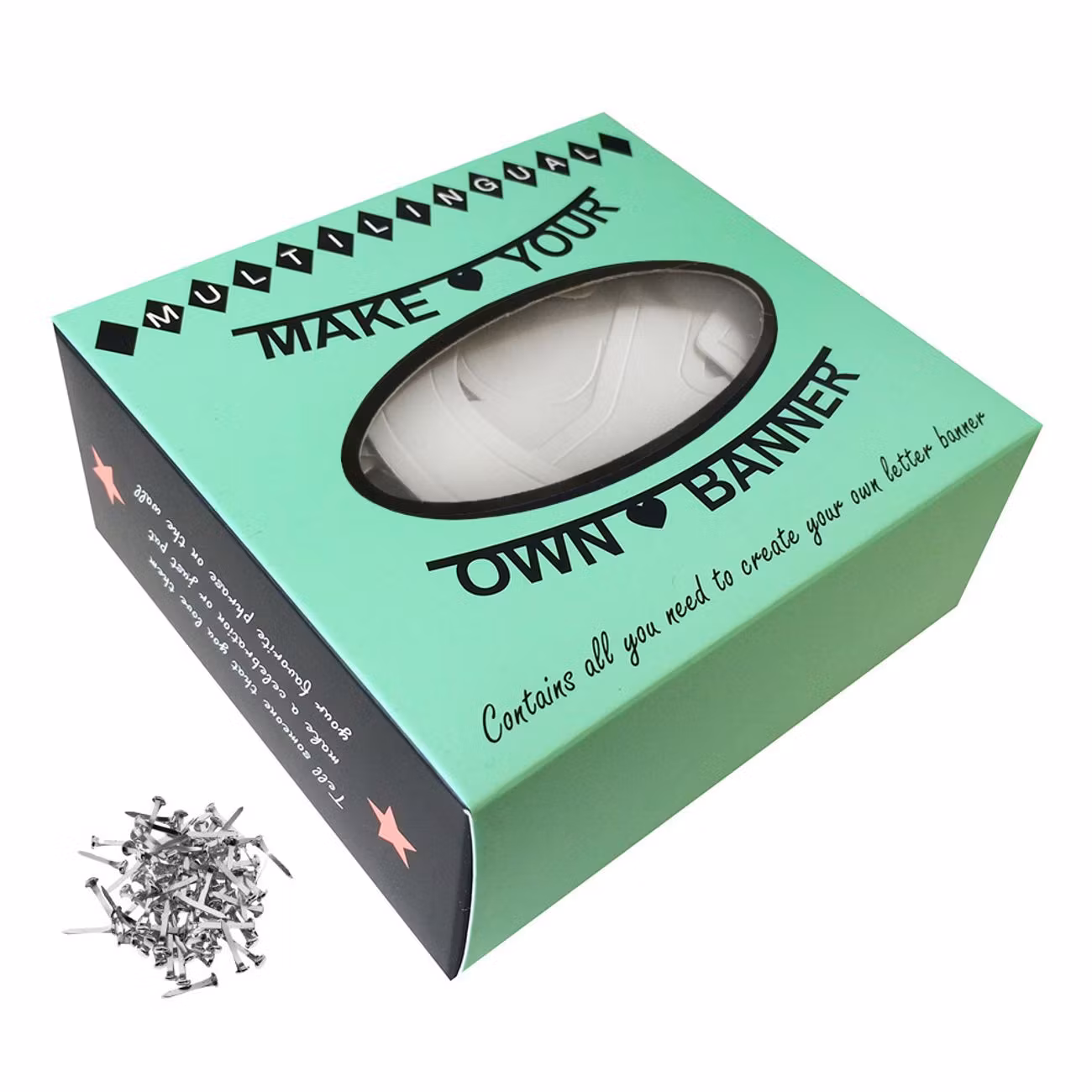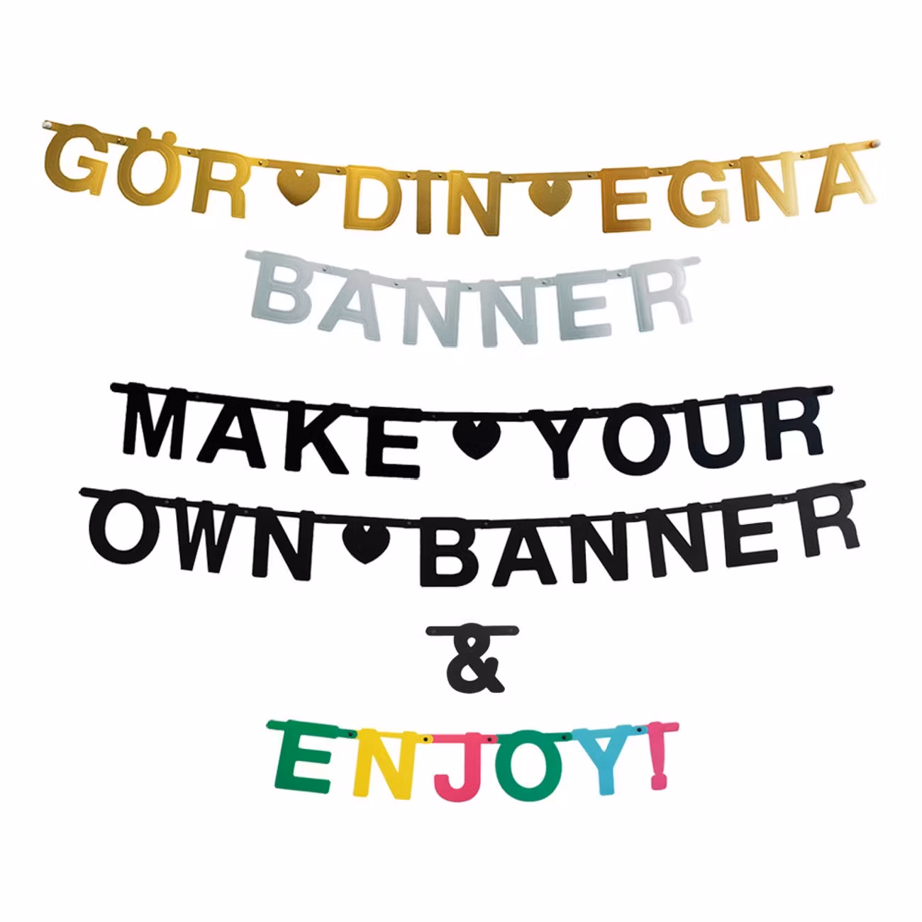 Gör-Det-Själv Girlang är tillverkad i hårt papper och levereras med påsnitar och elastiska trådar för enkel montering och upphängning. Girlangen finns i fyra olika utföranden; Bokstäver Svart, Bokstäver Guld, Bokstäver Silver, Bokstäver Färg och Siffror Svart.