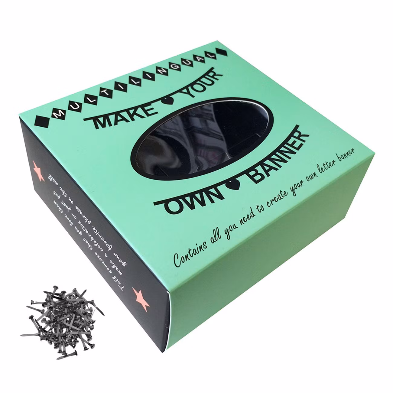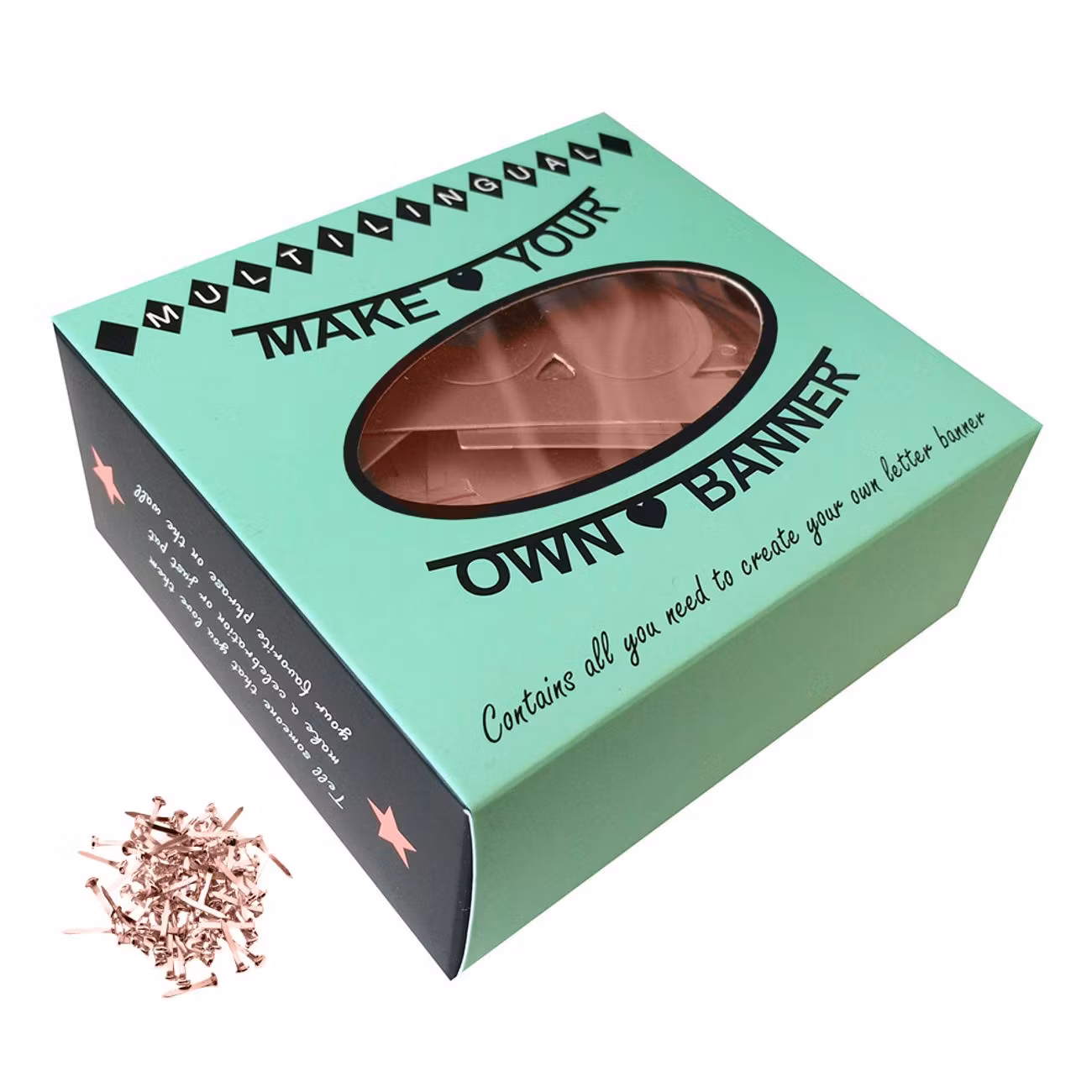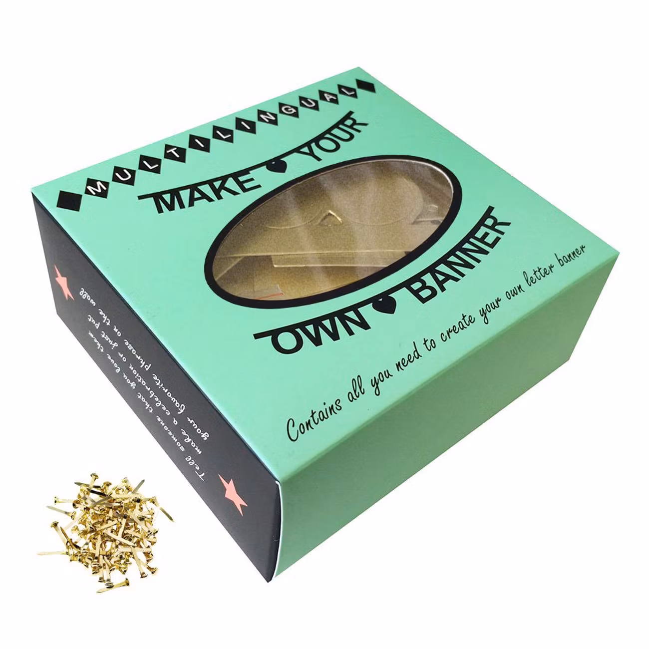 Gör-Det-Själv Girlang är tillverkad i hårt papper och levereras med påsnitar och elastiska trådar för enkel montering och upphängning. Girlangen finns i fyra olika utföranden; Bokstäver Svart, Bokstäver Guld, Bokstäver Silver, Bokstäver Färg och Siffror Svart.