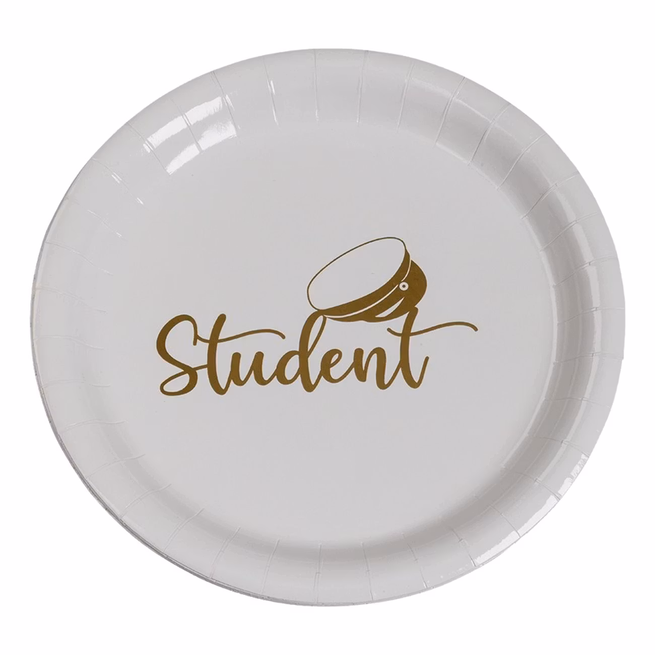 Papperstallrikar Studenten inkluderar åtta stycken runda tallrikar. Tallrikarna är vita med ordet "student" och en studentmössa i guld. Tallrikarna är tillverkade av papper och har en diameter på ca 23 cm.