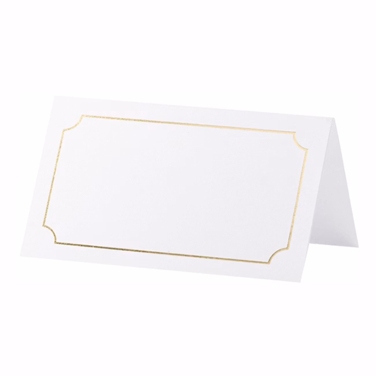 Placeringskort Guldram innehåller 10 st vita kort i papper med guldram som mäter ca 9.5 x 5.5 cm.