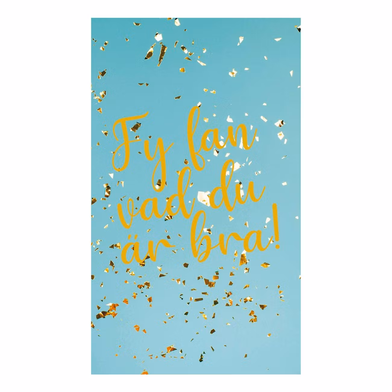 Studentkort Fy Fan Vad Du Är Bra föreställer en blå himmel med guldkonfetti med frasen "Fy fan vad du är bra!" i snirklig guldtext. Ett perfekt komplement till presenten, eller att ge som det är med ett fint meddelande i!