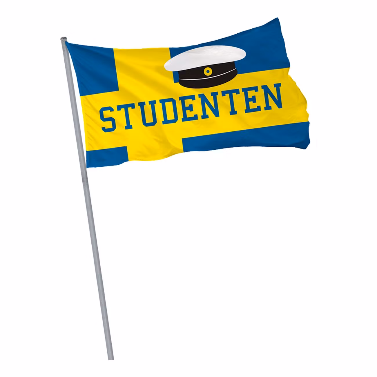 Sverigeflagga Studenten är en snygg flagga med motiv av en studenthatt och texten: "studenten" i flaggans centrum. Flaggans grund är en Sverigeflagga som är heltäckande. Passar utmärkt till studentfirande!