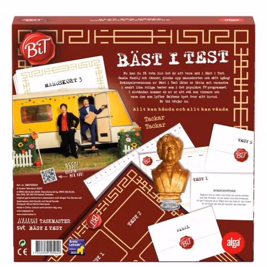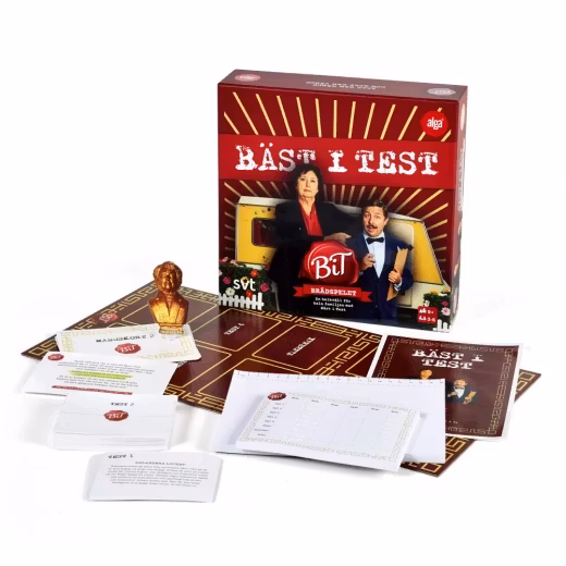 Brädspelsversionen av Bäst i Test låter er tävla mot varandra i minst lika roliga tester som i det populära TV-programmet. Alla turas om att vara Babben Larsson och David Sundin och i slutändan kommer en av er att stå som vinnare - och vara den som lyfter Babbens byst över sitt huvud. Er tid börjar nu.