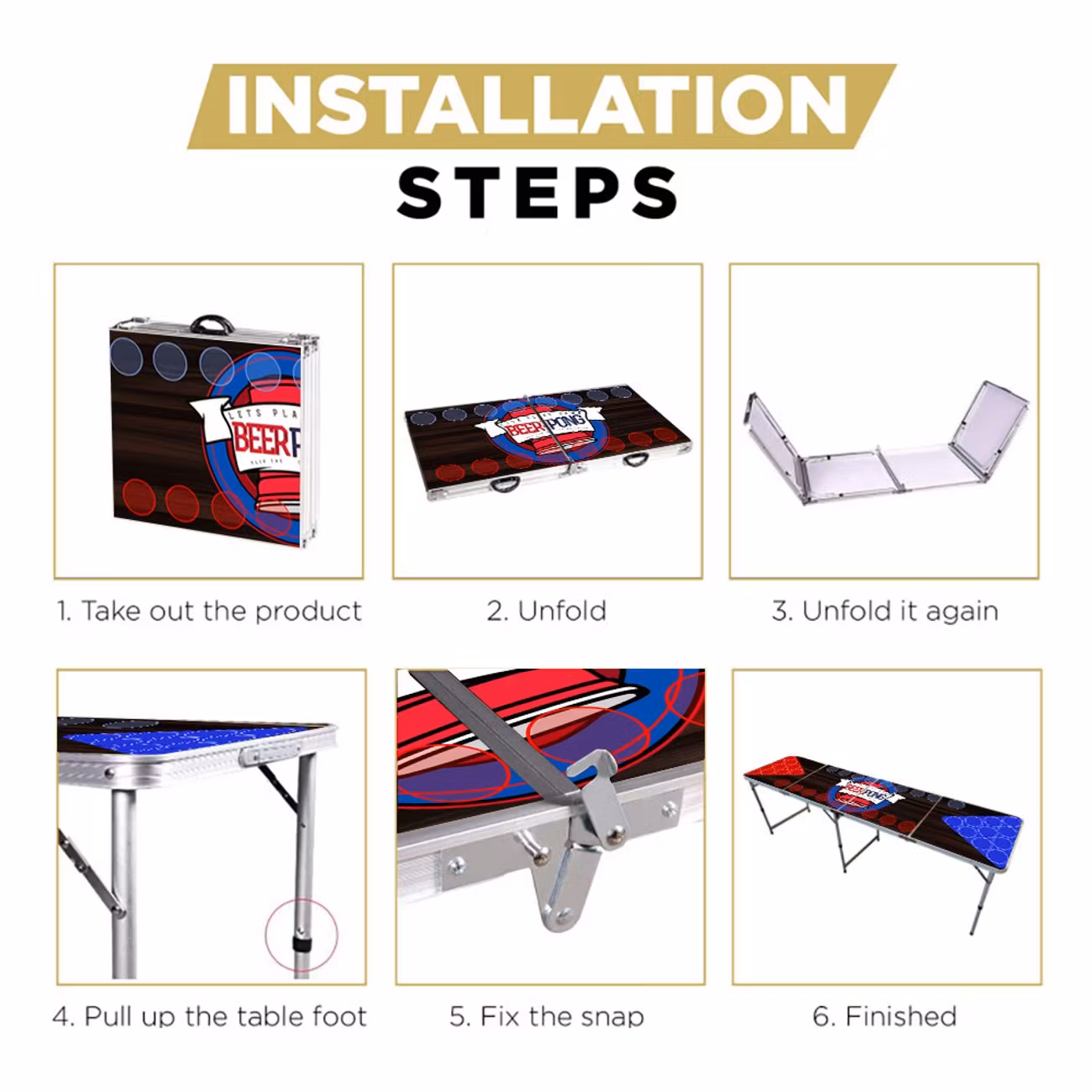 Beer Pong Bord (med Flip Cup) mäter 240cm långt och 60cm brett, vilket motsvarar de officiella tävlingsmåtten som används i bl.a. Världmästerskap i Beer Pong. Bordet är höj- och sänkbart och kan justeras utifrån egna önskemål (70/55 cm). Bordet kan med enkelhet transporteras och bäras med hjälp av det medföljande handtaget och mäter endast 60x60x14 cm i hopfällt läge. Bordets ben och stomme är tillverkade i aluminium och spelytan är vattenavvisande varpå ölspill enkelt torkas bort med varmt vatten och en trasa.