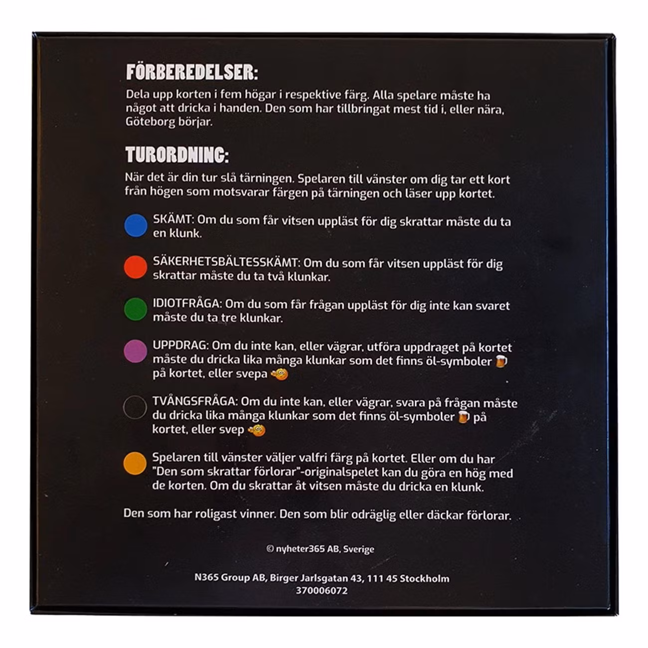 Den som skrattar åt ett dåligt skämt, svarar fel på en fråga eller misslyckas med ett uppdrag får dricka! En garanterad ice-breaker på festen som bjuder upp till skratt och höjer stämningen på festen.