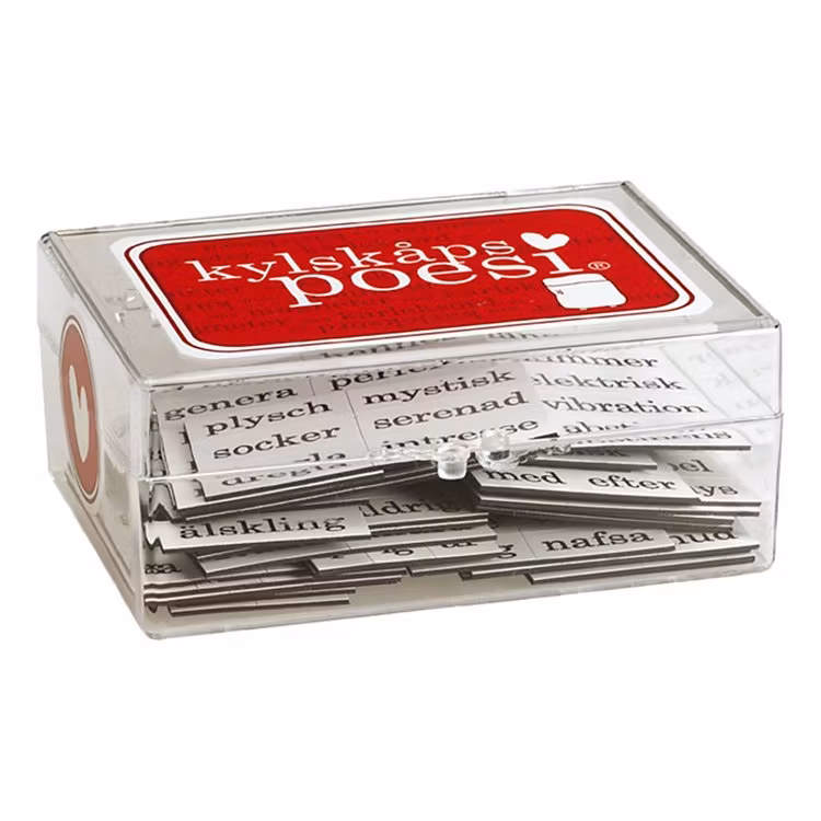 Kylskåpspoesi är en perfekt present och skapar ett naturligt sätt att umgås och kommunicera runt hemmets hjärta-köket. Låt magneterna sitta uppe och bjud hem dina vänner. Vi garanterar att du får ett roligt meddelande eller en söt hälsning på ditt kylskåp.