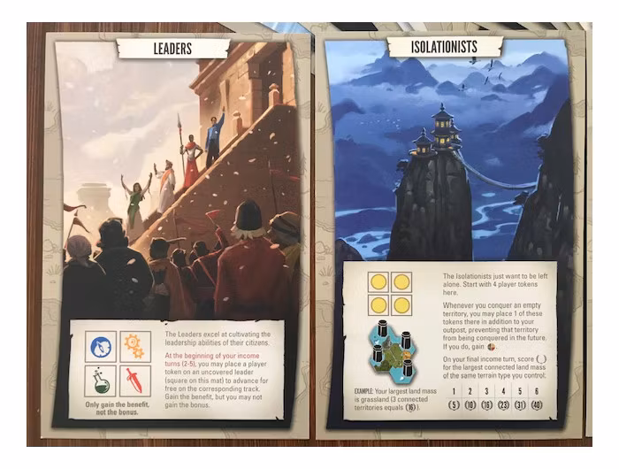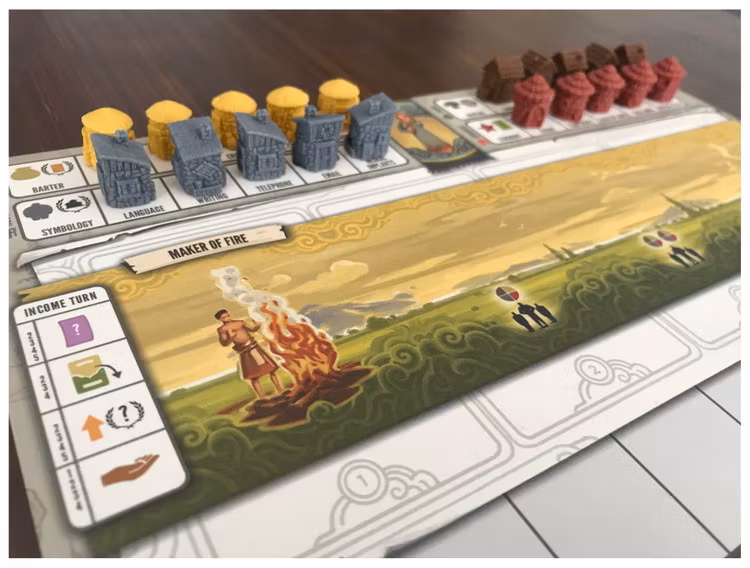 In Tapestry, you start from nothing and advance on any of the four advancement tracks (science, technology, exploration, and military) to earn progressively better benefits. You can focus on a specific track or take a more balanced approach. You will also improve your income, build your capital city, leverage your asymmetric abilities, earn victory points, and gain tapestry cards that will tell the story of your civilization.