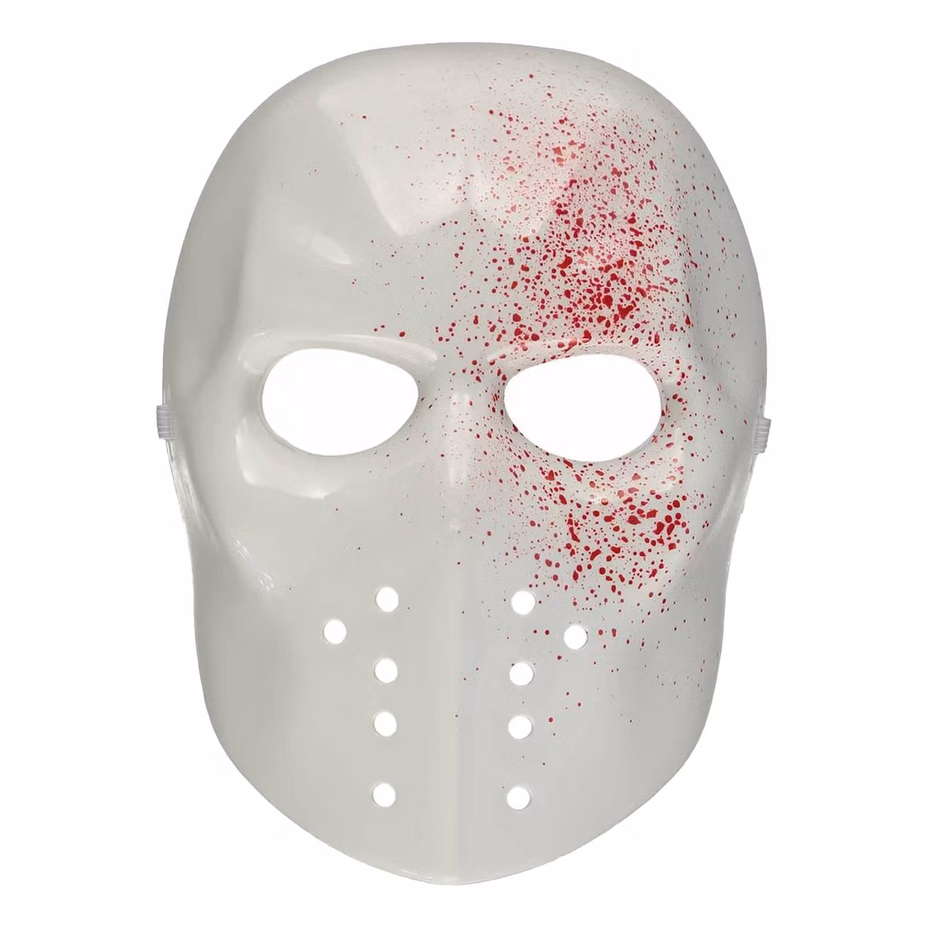 Blodig Vit Mördarmask är en mask som liknar en gammaldags hockeymask och kommer med blodstänk mot ena ögat. Masken täcker endast ansiktet och fäster med hjälp av ett elastiskt band på baksidan av huvudet. Hål för ögon och mun finns.