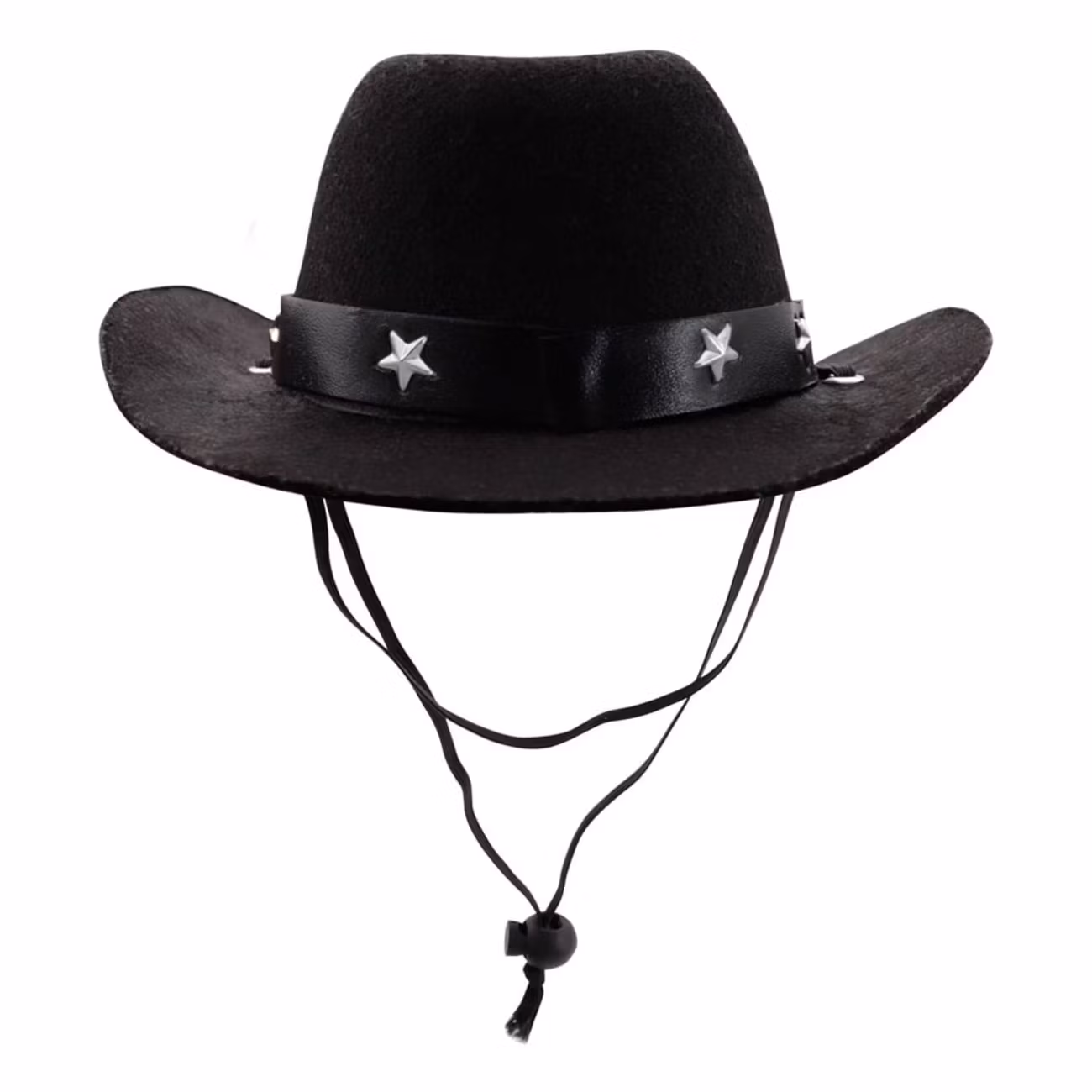 Cowboyhatt för Hund kommer i en storlek som passar såväl katten som hundar genom att snöret som fäster hatten är justerbart. Välj mellan sandfärgad och svart hatt!