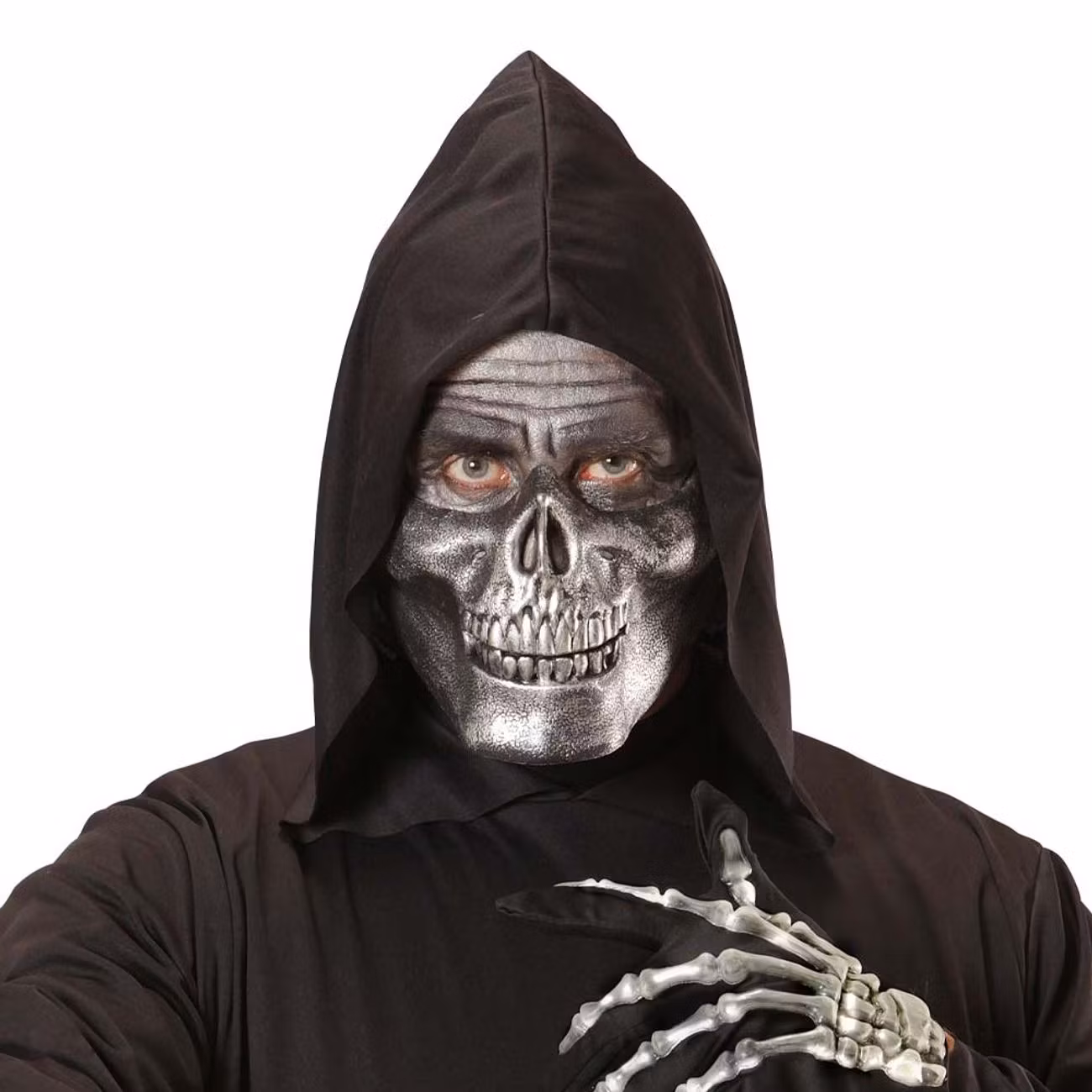 Dödskalle Halvmask Silver är en häftig silverfärgad döskalle-halvmask. Masken har andningshål och täcker ditt ansikte upp till området under ögonen. Köp till matchande hudfärg för att få den look som på bilden!