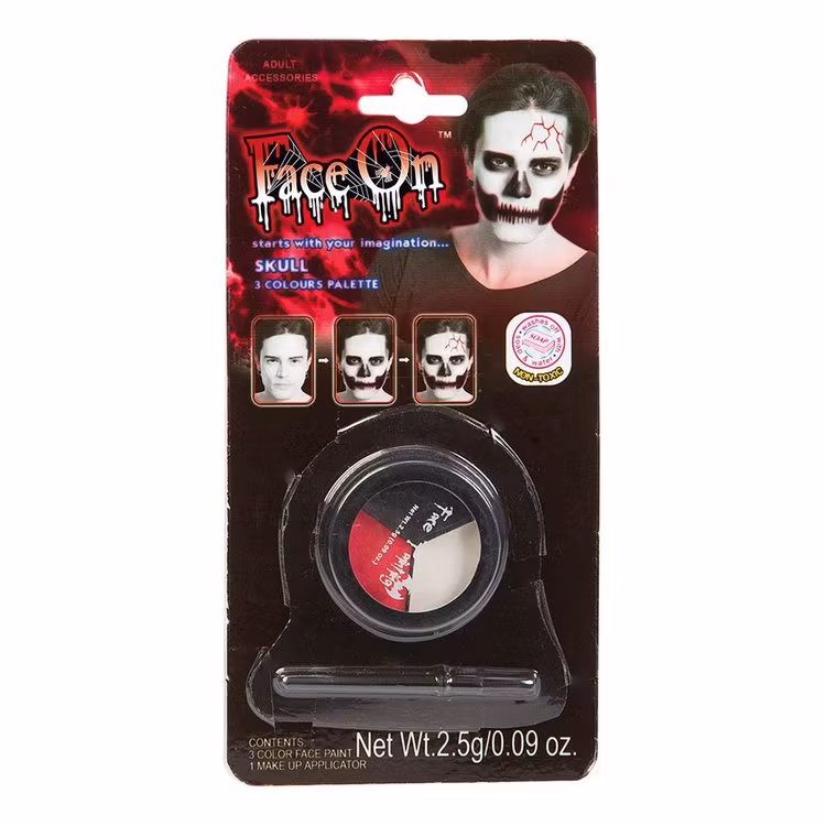 Ska du klä ut dig till ett skelett på halloween i år? Perfekt, här är produkten för dig! Ett sminkset med allt du behöver för att bli ett skelett även i ansiktet. Färgen är oljebaserad och innehåller ricinolja. Färgerna i burken är röd, svart och vit och det medföljer även en pensel.