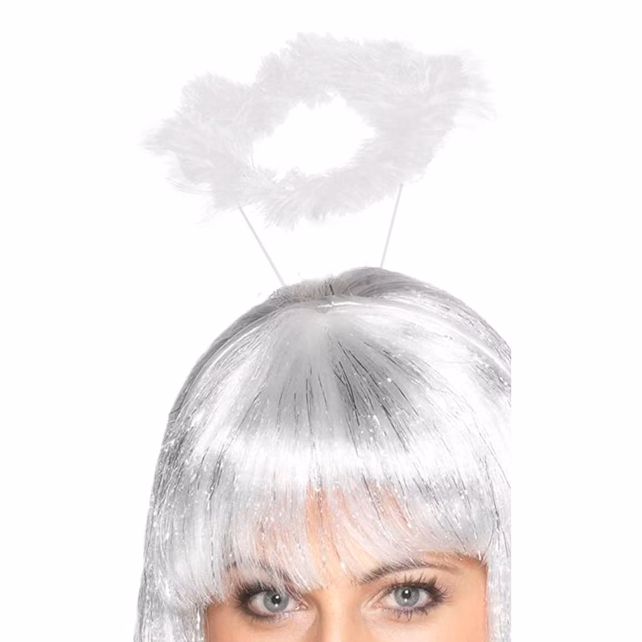 Vit gloria gjord av fjädrar, passar bra om man vill vara en snäll ängel. Glorian sitter fast på ett diadem, vilket gör att den är smidig att ha på sig.
