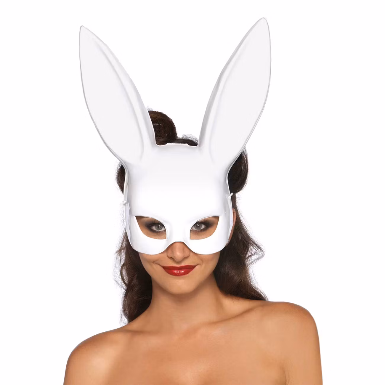 Med denna kaninmask blir du lite hemlighetsfull och lite gåtfull. Kom till maskeraden med masken och du kommer garanterat väcka mycket nyfikenhet. Det är ingen risk att du inte kommer att synas för masken är alldeles vit med långa, fina kaninöron. Den täcker halva ansikten och har hål för ögonen.