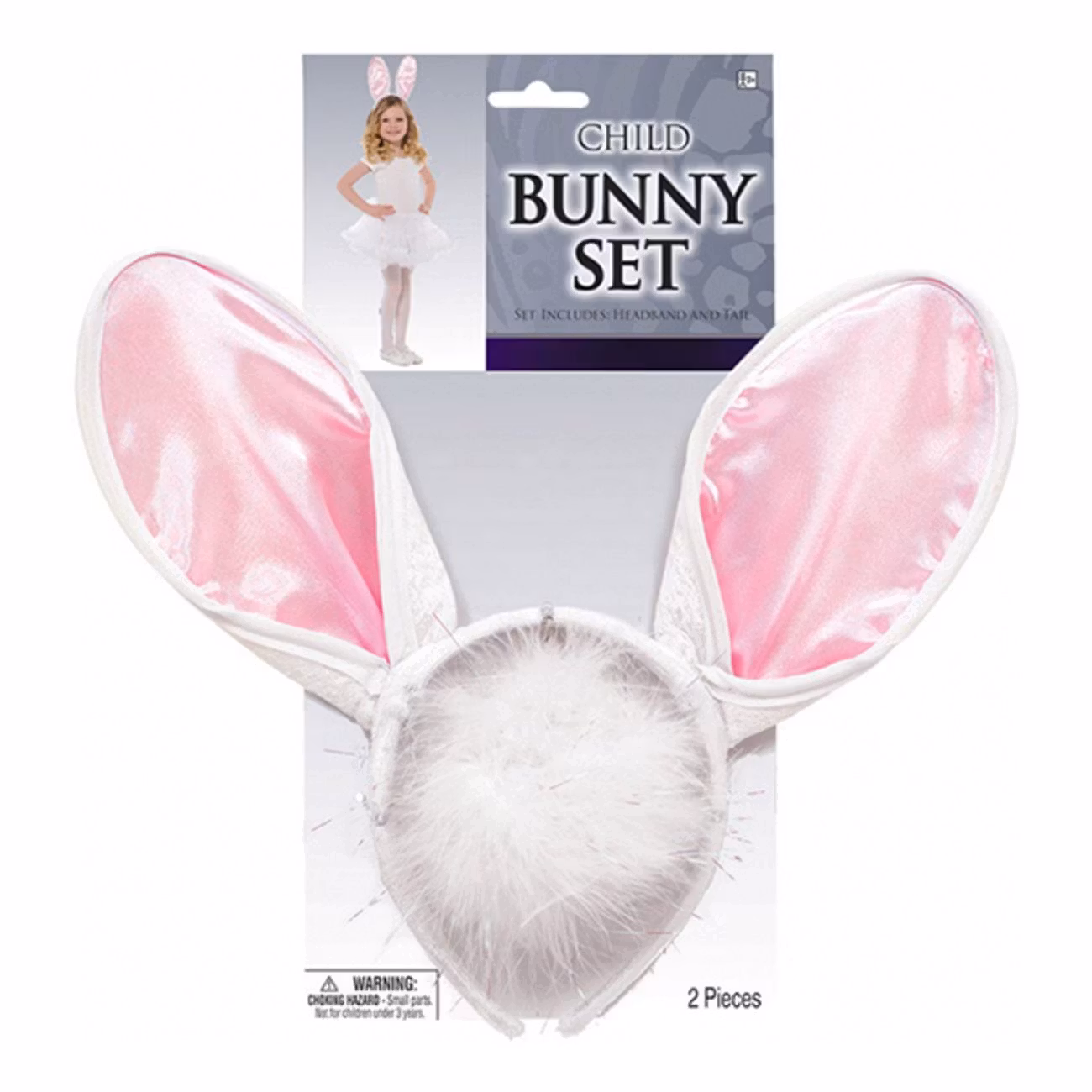 Kaninset Barn består av ett vitt diadem med kaninöron med rosa detaljer och en fluffig vit kaninsvans.