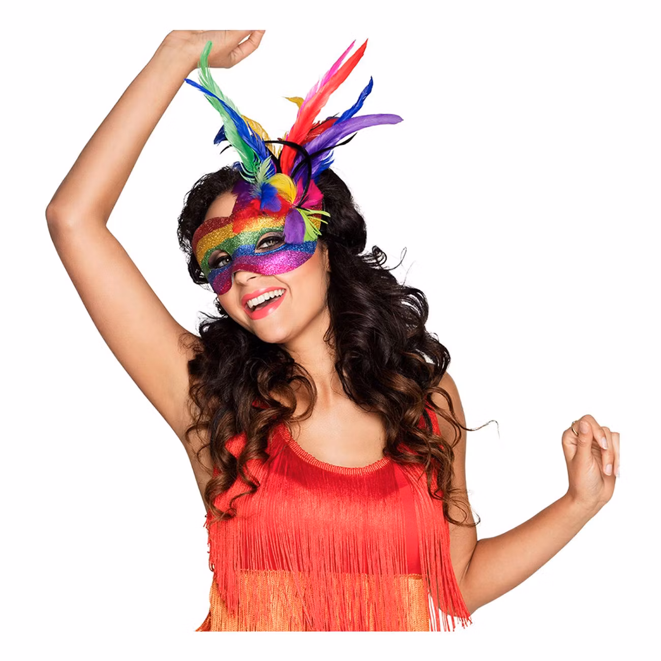 Vacker venetiansk mask med fjädrar och glamour. Masken kommer i regnbågens alla färger och passar till såväl maskeradfester som till pride- och halloweenfesten.