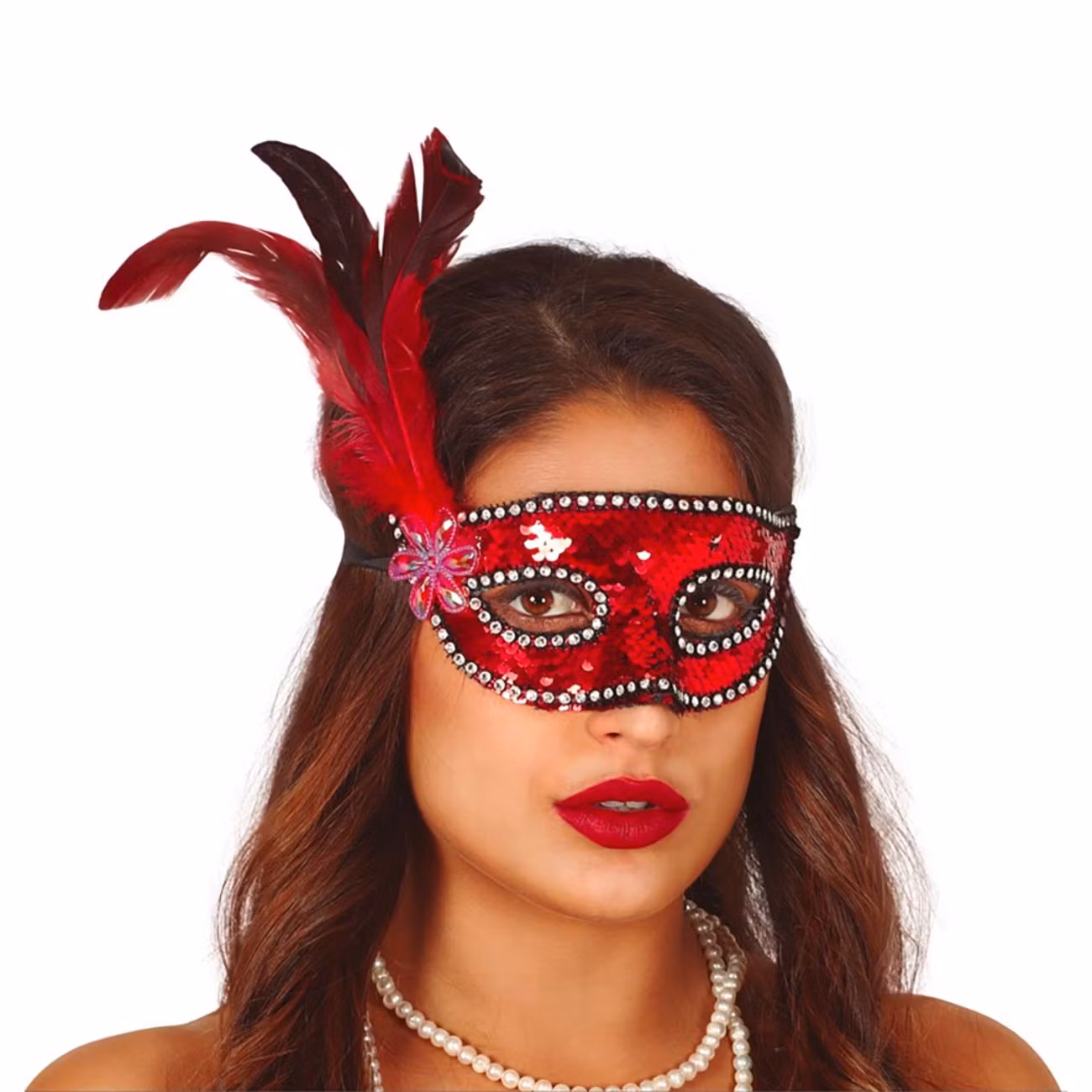 Röd Ögonmask med Fjäder passar utmärkt för en härlig maskeradbal, för middagar med Great Gatsby-tema eller helt enkelt för fester där du vill klä upp dig lite extra. Den här är extra elegant med sina paljetter och strass i rött med fjädrar på sidan.