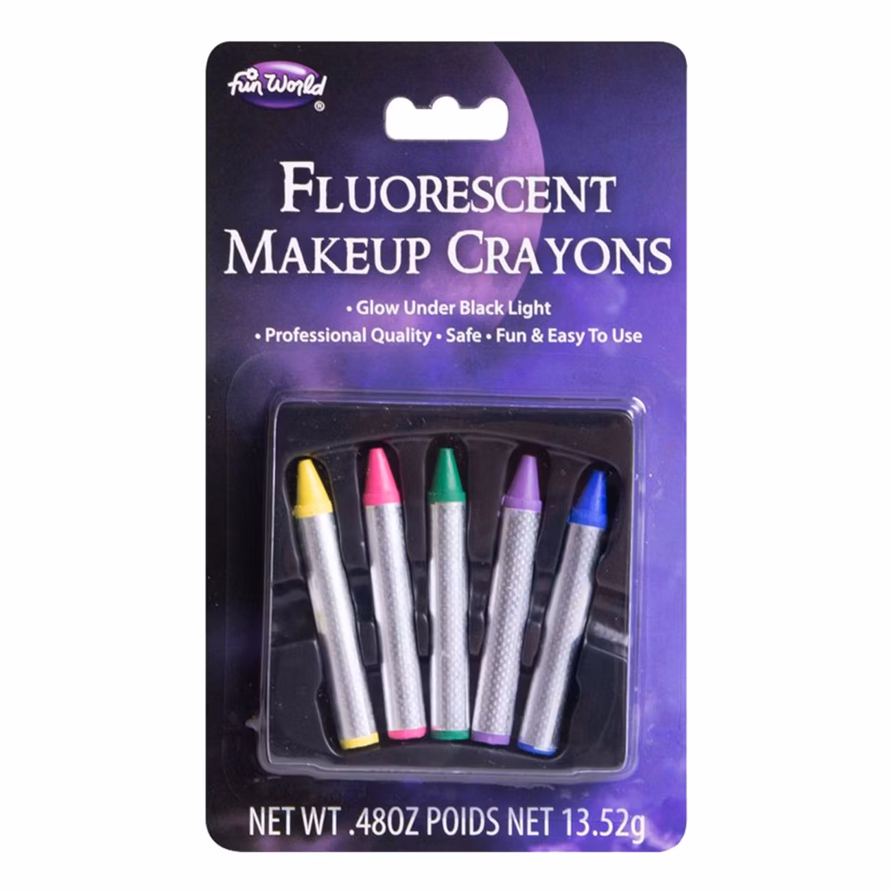 Sminkkritor UV Neon är 5 kritor i olika neonfärger som lyser under UV-lampor. Kritorna är lätta att tvätta bort med vanlig tvål och vatten efter att du har använt dem.