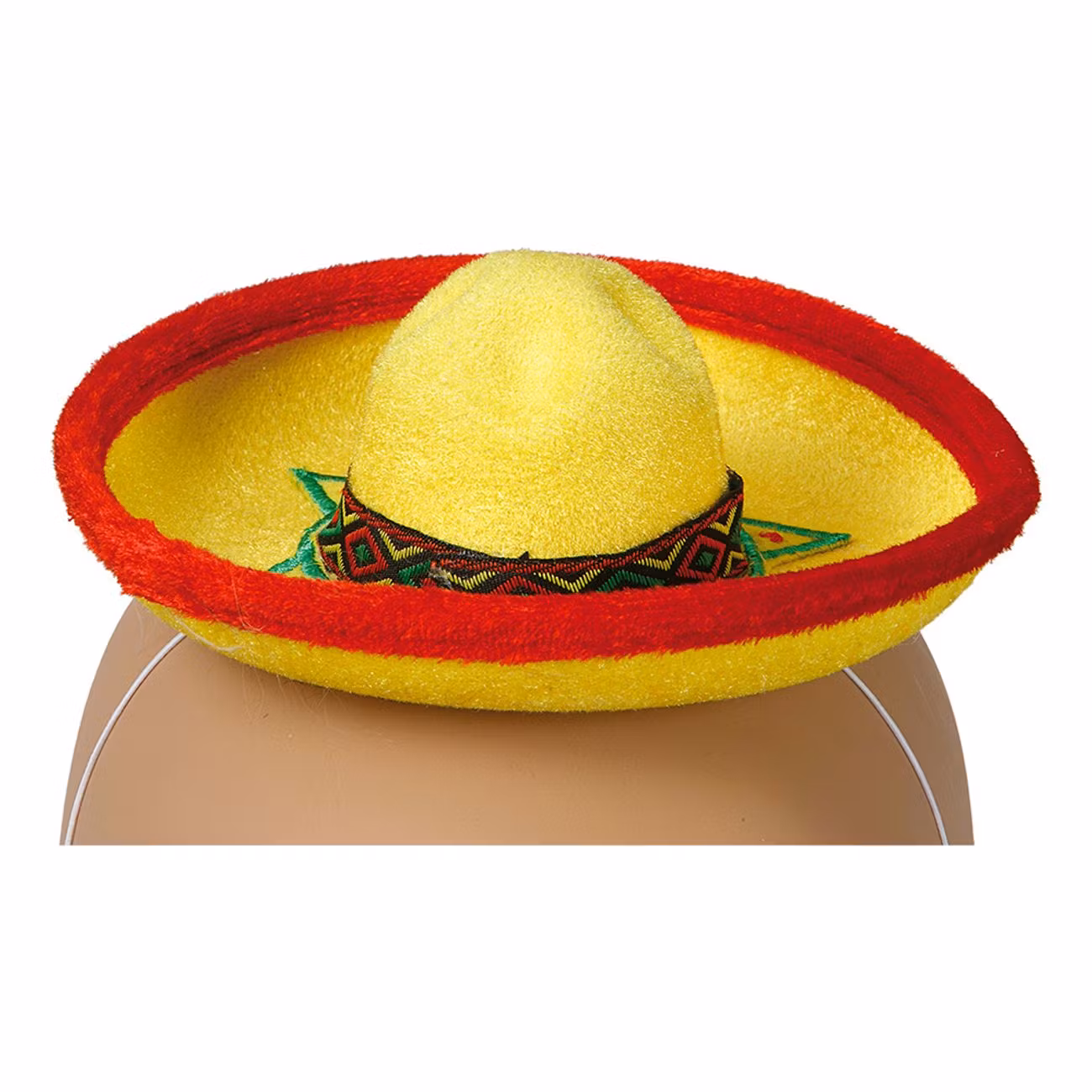 Sombrerohatt Mini kommer i form av en liten gul sombrero i tyg med röd trim och mönstrat läckert band runtom som tar dig ända bort till Mexiko. I känslan alltså. Hatten sitter på plats med vitt elastiskt band under din haka.