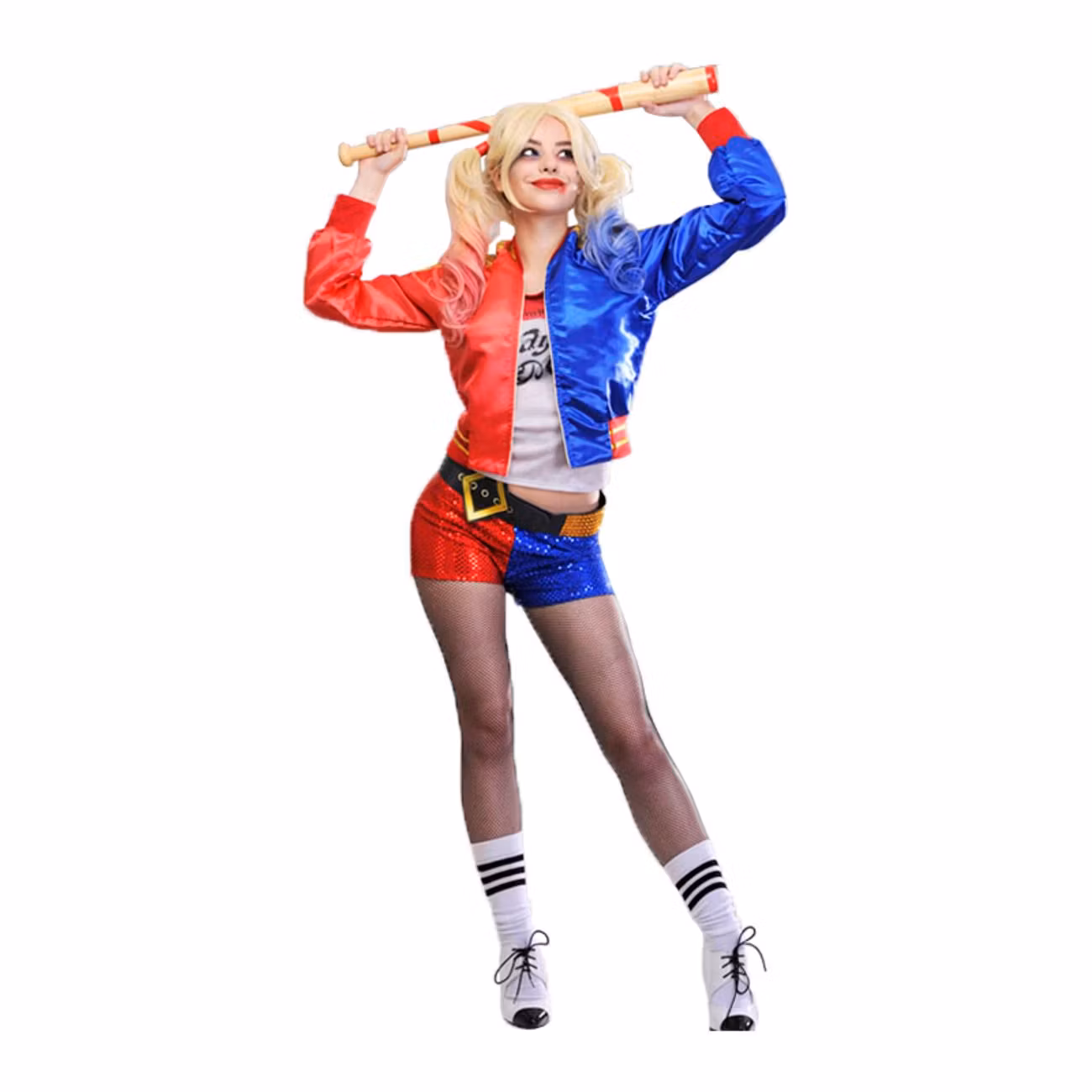 Medföljer gör också ett par blå och röda korta shorts med skimrande paljetter, ett svart enklare bälte med guldnitar och spänne i tyg med kardborre. Sist men inte minst ingår även ett par svarta nätstrumpbyxor med små maskor för en komplett Harley Quinn-look. Skor, strumpor, slagträ, peruk och smink ingår ej.