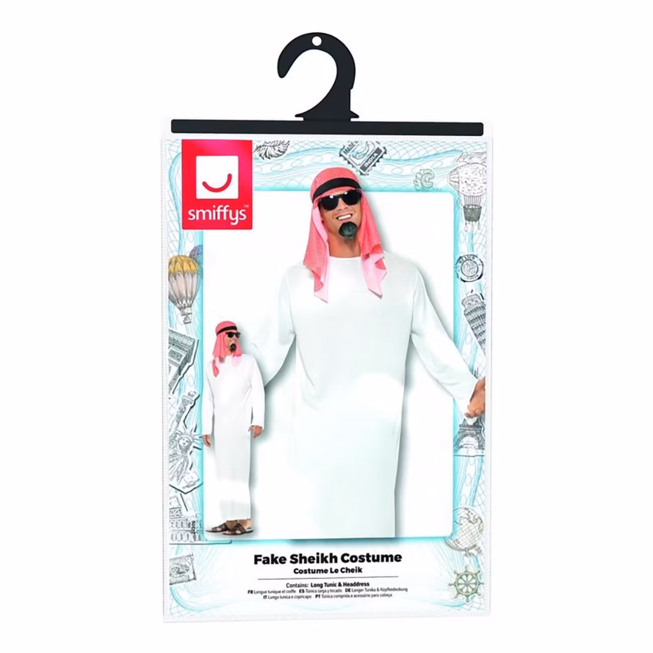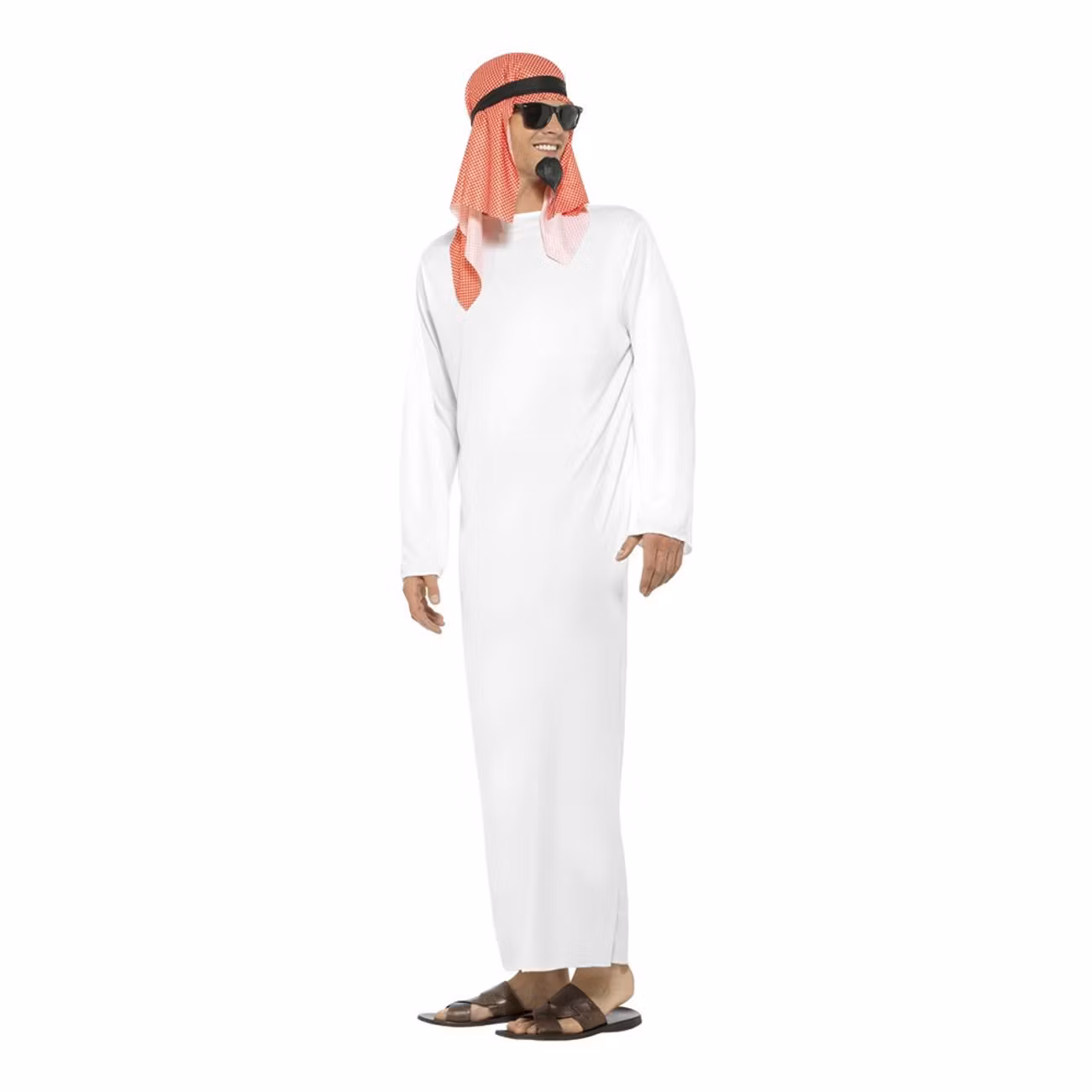 Traditionell Shejk Maskeraddräkt inkluderar en vit thobe samt en röd/vit ghutra med svart band. Skägg och solglasögon ingår ej.