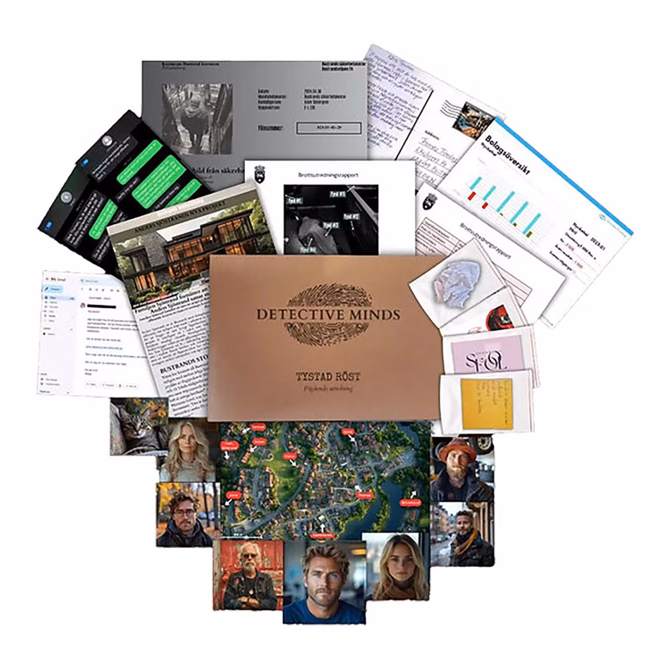 Detective Minds Tystad Röst är ett klurigt och spännande mordmysteriespel där ni tillsammans tar er an rollen som utredare. En perfekt aktivitet för spelkvällen, murder mystery-temat eller som present till true crime-nörden!