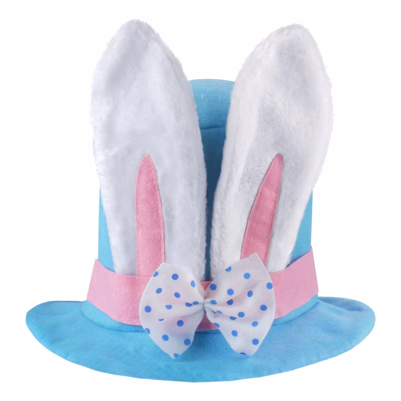 Hatt med Kaninöron för Barn är en blå höghatt av mjukt material som kommer med ett par vita kaninöron, ett rosa band och en prickig rosett på. Hatten kommer i en storlek som passar barn.