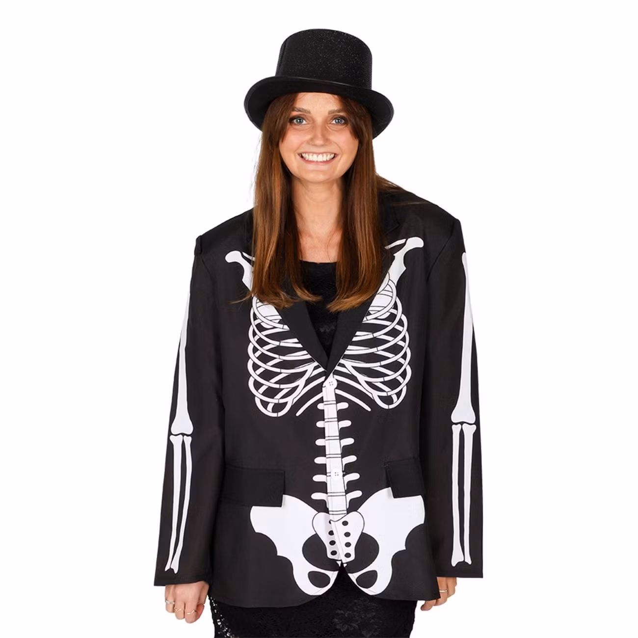 Kavaj Skelett är en svart kavaj tryckt med vitt skelettmotiv på framsidan. Perfekt om du vill vara ett stiligt skelett på halloweenfesten!