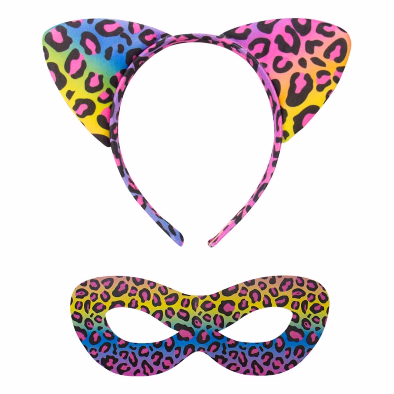 80-tals Panter Diadem & Ögonmask innehåller ett diadem och en ögonmask tillverkade i polyester och plast. Mönstret är ett pantermönster i starka färger. Diademet kan justeras i olika storlekar och ögonmasken har ett elastiskt band som fästs bakom huvudet.