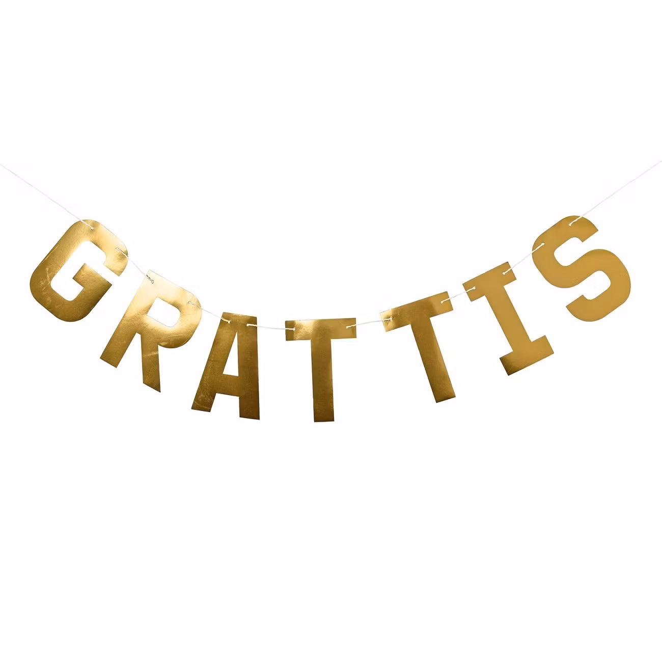 - 1 st Girlang "Grattis" i guld metallic (Material: Papp. Längd: 2 meter. Mått bokstäver: ca 16 x 11 cm)