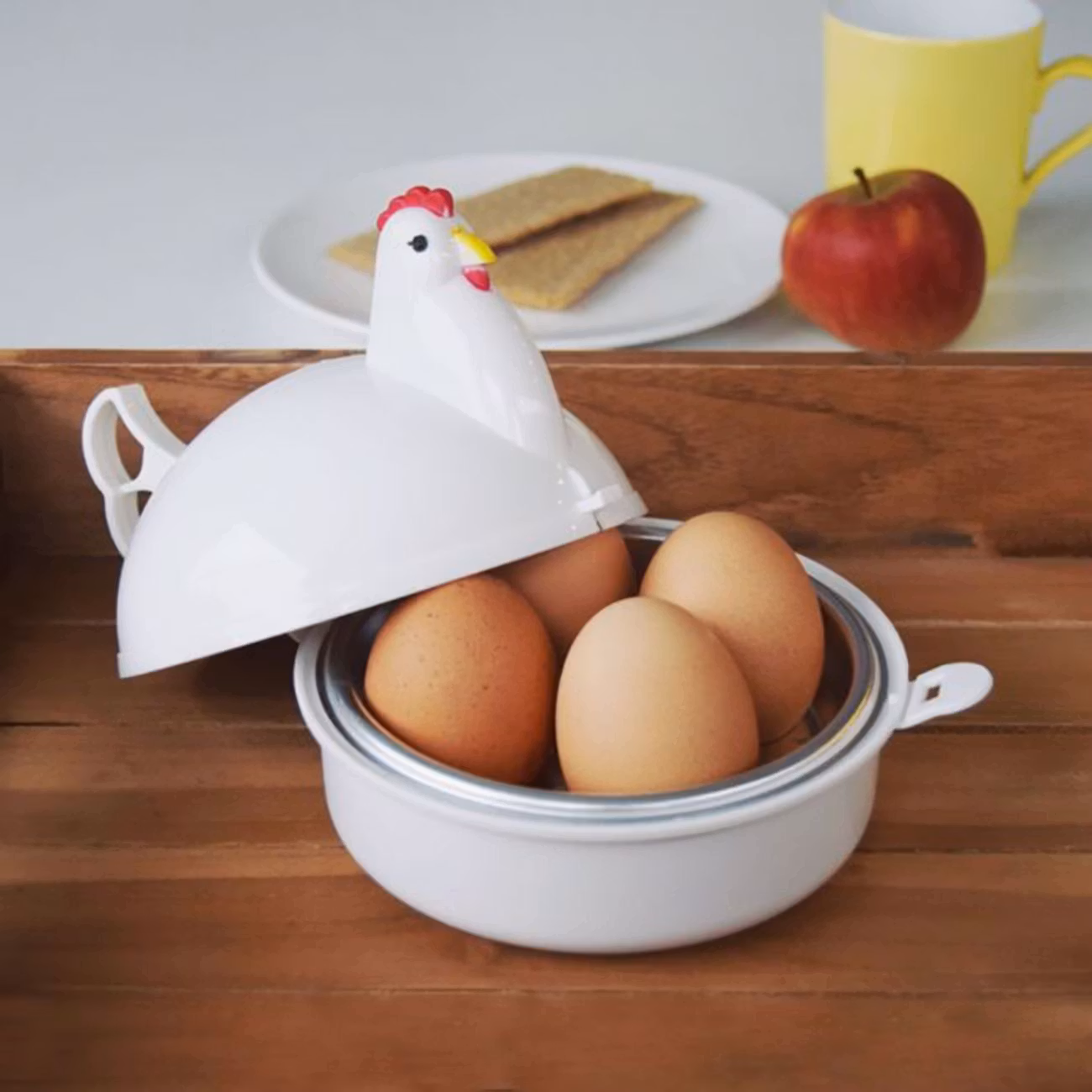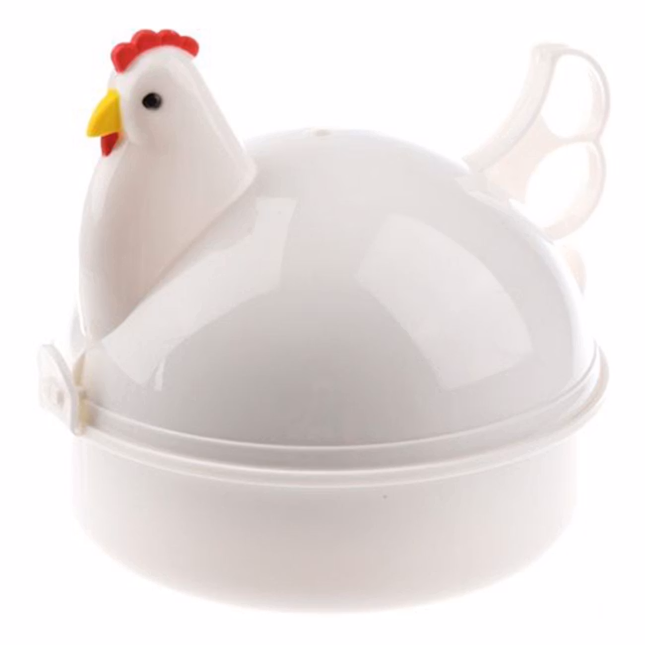 Äggkokare för Mikrovågsugn ser ut som en vit höna med gul näbb och röd kam. Äggkokaren rymmer fyra ägg. Sätt in äggkokaren i mikrovågsugnen på 600 w och sätt timern på fem minuter för löskokta ägg och sju minuter för hårdkokta ägg. Du kan också ställa in mikrovågsugnen på 500 w och timern på fem och en halv minuter för löskokta ägg och åtta minuter för hårdkokta. Äggkokaren är 12,5 x 10 cm och väger 114 g.