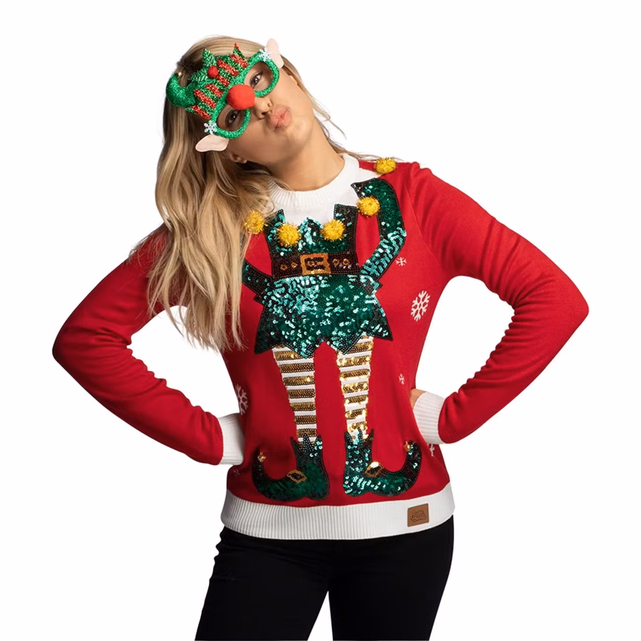 Är du den spexiga på jul som gärna drar ett och annat skämt på middagen, men även ställer upp som tomte om det finns barn i närheten? Då kommer denna tjusiga (och fula) nissetröja passa dig exemplariskt. Tröjan kommer i en röd och vit färg med en nissekropp i glitter - perfekt till julen med släkten eller julfesten.