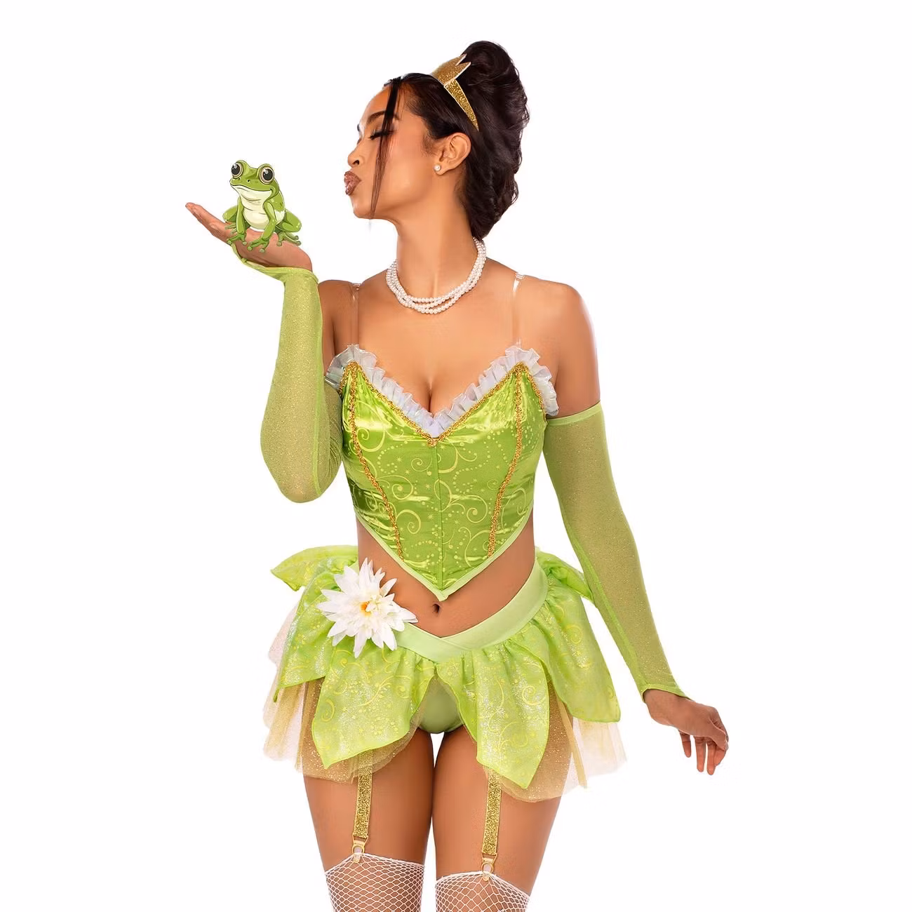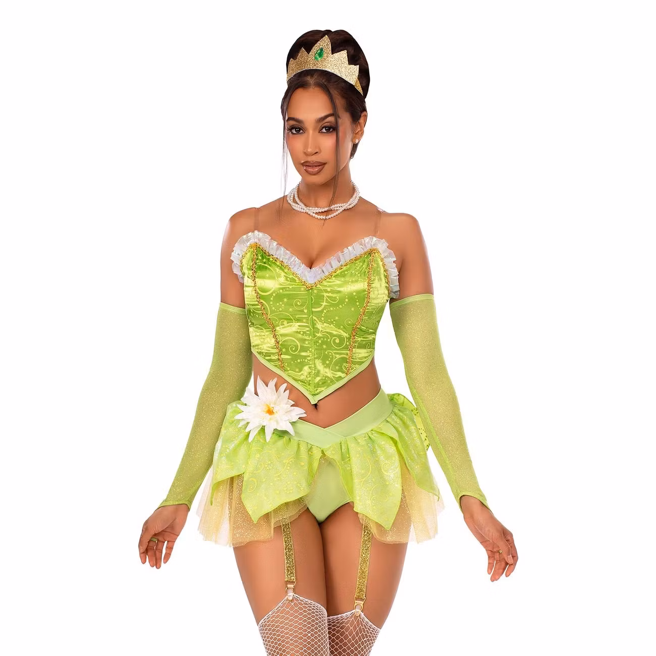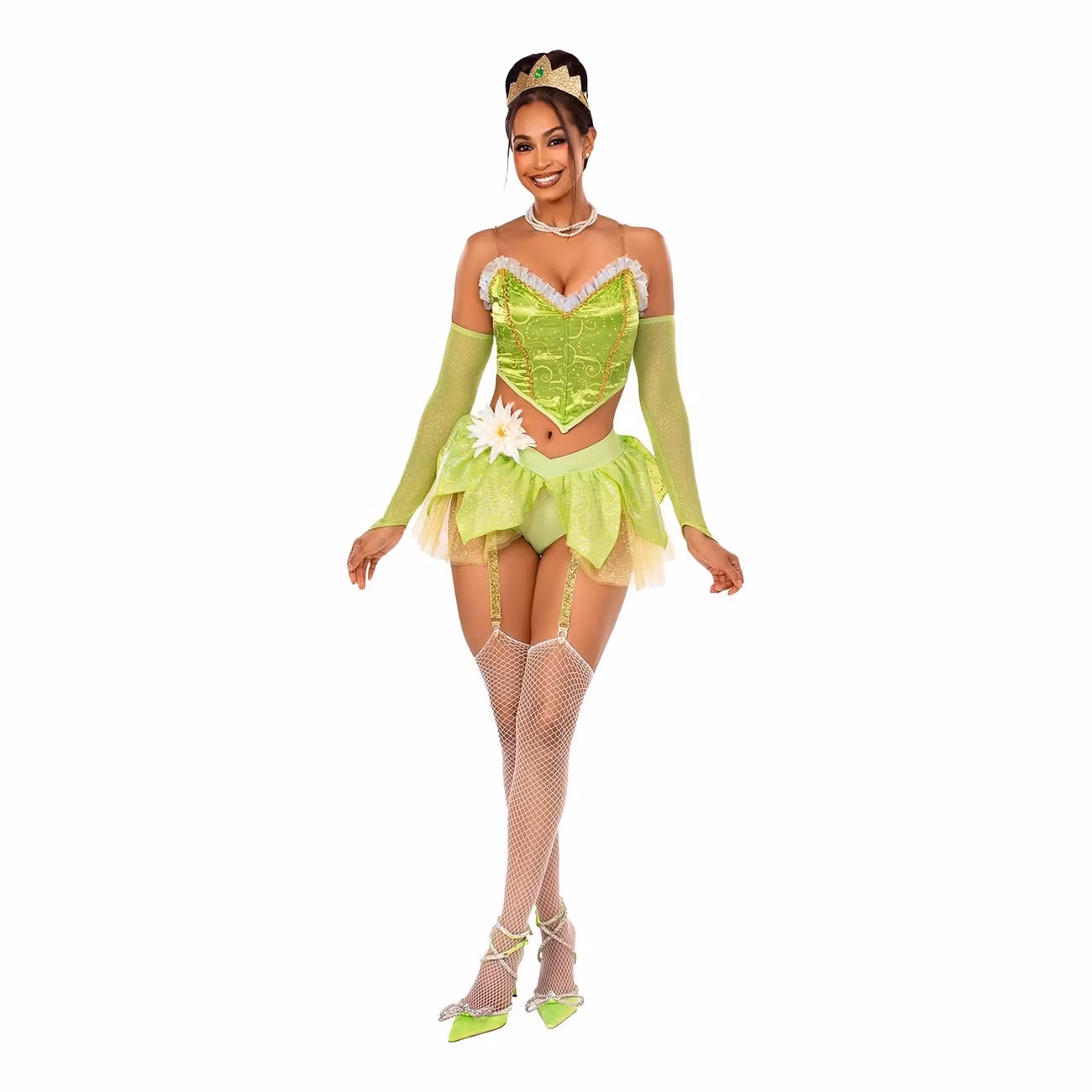 Älva Drottning Grön Deluxe Maskeraddräkt består av en korsettliknande top i glansig satin med transparenta avtagbara axelband, guldiga snirkelbroderier och volanger, samt ett par långa gröna fingerlösa handskar i glittrande finish. Medföljer gör även en matchande nederdel i form av trosor med fastsatt kjol i lager-på-lager effekt i tyll, med en vit lotusblomma i midjan samt två strumbebandshållare med clips. Till detta ingår också en guldglittrande krona med juvel.