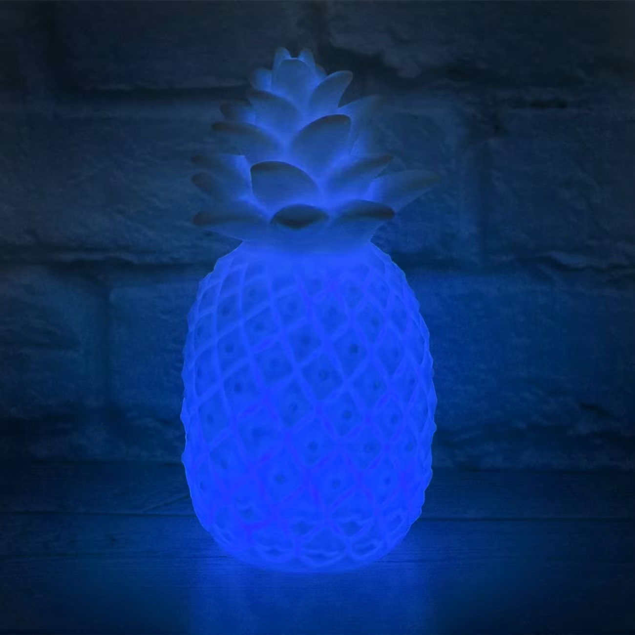 Ananas Mood Light drivs av batterier och lyser i 4 härliga färger: blå, grön, orange och rosa. Lampan växlar mellan färgerna helt på egen hand.