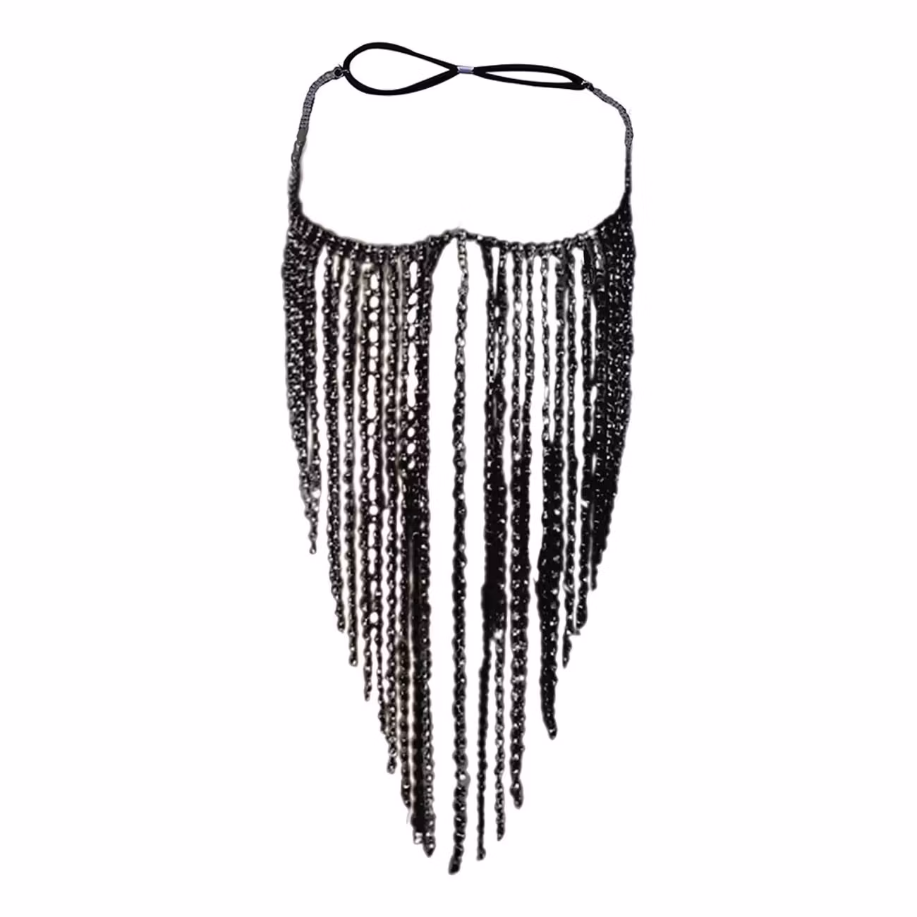 Ansiktsslöja med Svarta Pärlor består av ett tätt band av glittrande svarta pärlor som pryds med långa, glänsande fransar som hänger ner och täcker ansiktet. Perfekt för maskerader, temafester eller när du bara vill kliva in i rummet med maximal mystik.