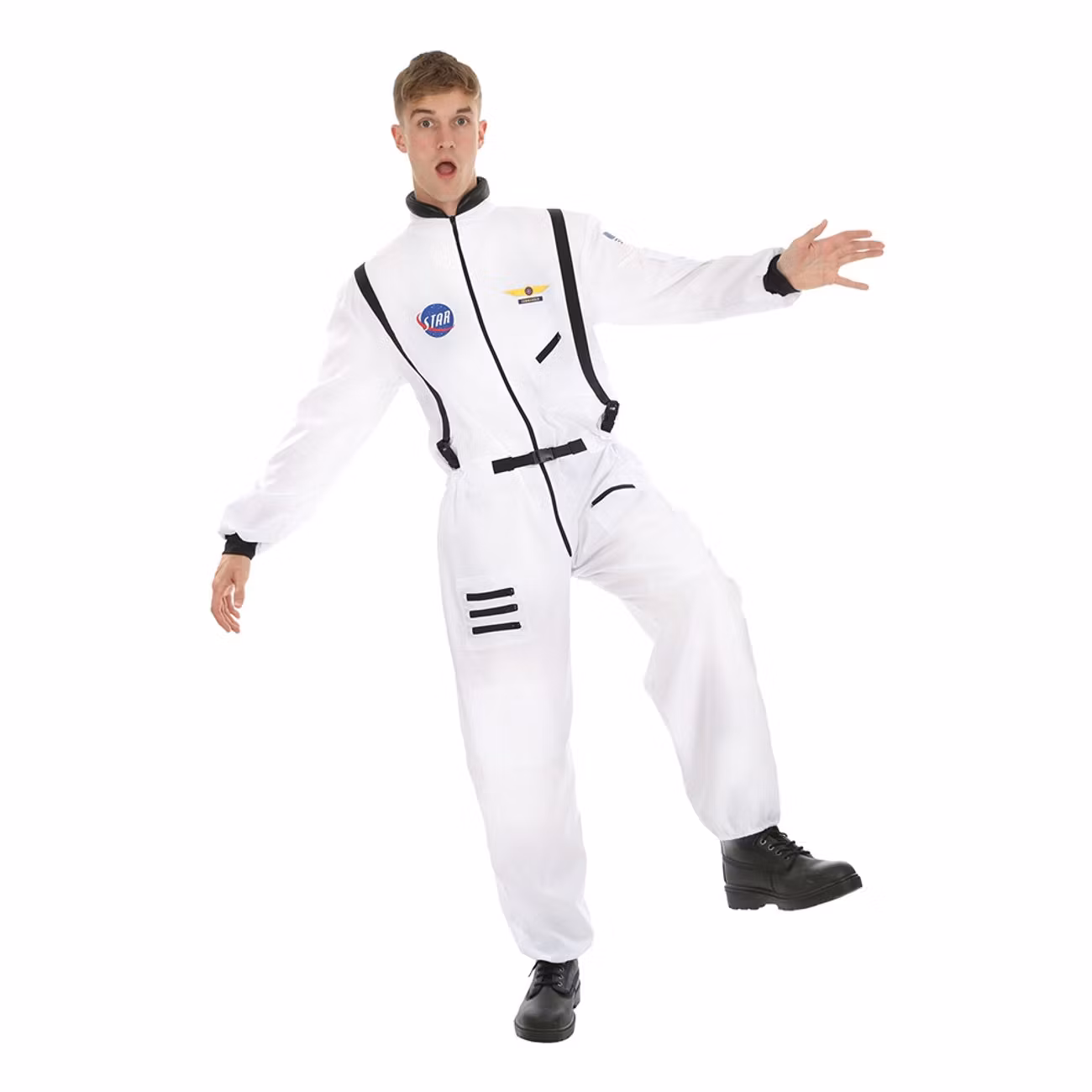 Astronaut Vit Maskeraddräkt inkluderar en vit jumpsuit med svarta detaljer som direkt får en att tänka på Armageddon, Fuglesang och Armstrong. Med den här dräkten gör du succé på varenda maskeradfest, oavsett om temat är hjältar, rymden eller yrken.