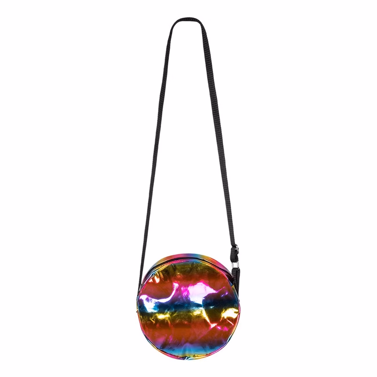 Axelväska Regnbåge Holografisk är rund regnbågsfärgad väska med skimrande, holografisk yta. Väskan har dragkedja och långt, justerbart axelband. Perfekt väska till Pride eller festivalen!