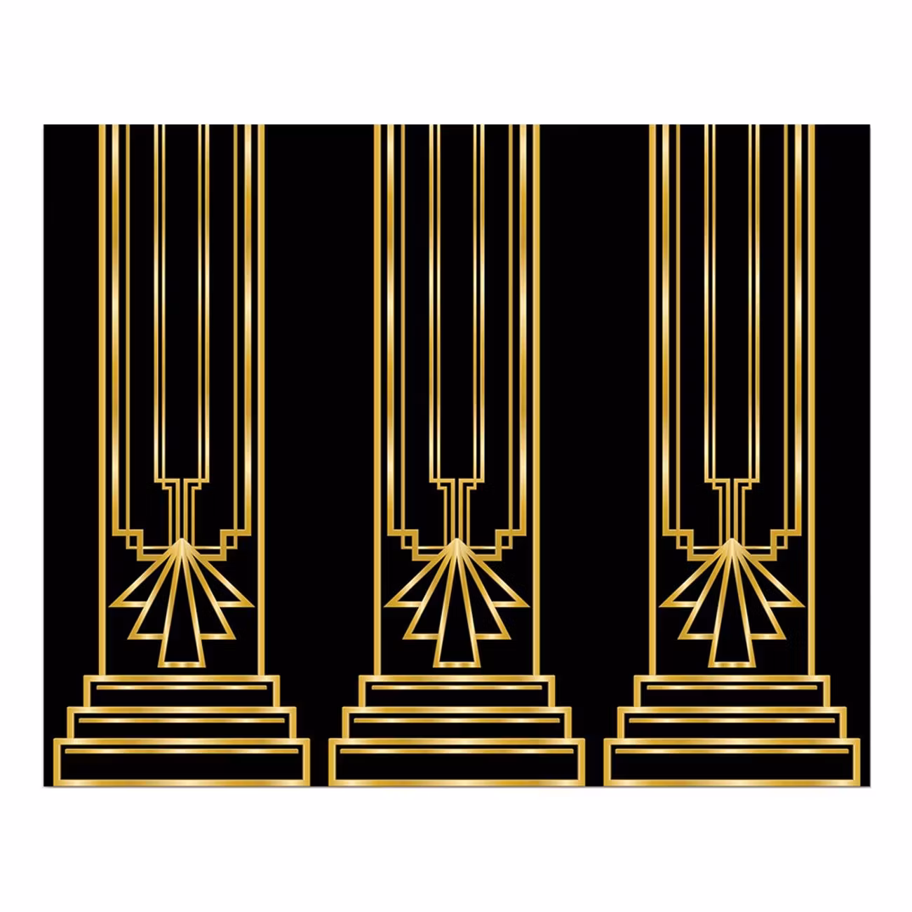 Backdrop Great 20's är en stor väggdekoration med svart bakgrund och motiv med 20-talsstuk i guld. Duken är tillverkad i tunn plast och mäter 1,2 x 9,15 meter.